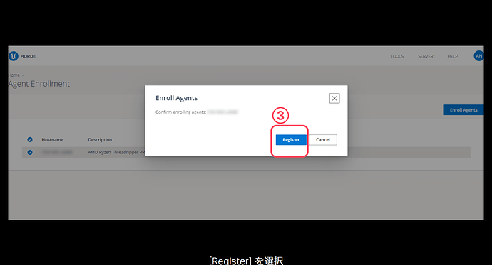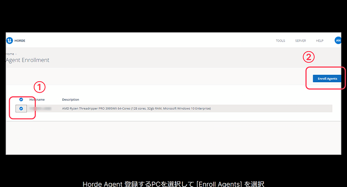 HordeAgent가 설치된 PC가 목록에 표시되므로 ①→②→③ 순서대로 하드웨어를 선택하고 [Enroll Agents] 버튼을 눌러 등록합니다.