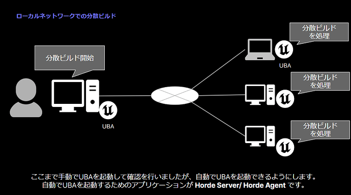 3. 로컬 네트워크에서 자동 분산 빌드 지금까지 수동으로 분산 빌드를 확인하는 방법에 대해 알아보았는데, 이제부터는 자동으로 분산 빌드를 수행하기 위한 설정 방법에 대해 알아보겠습니다. 실제로 분산 빌드를 수행하기 위해서는 분산 대상과 분산 작업을 제어해야 하는데, UBA는 빌드를 수행하기 위한 애플리케이션이며, 이 UBA에 대한 자동 배포 제어를 수행하는 것이 HordeServer / HorderAgent이다.