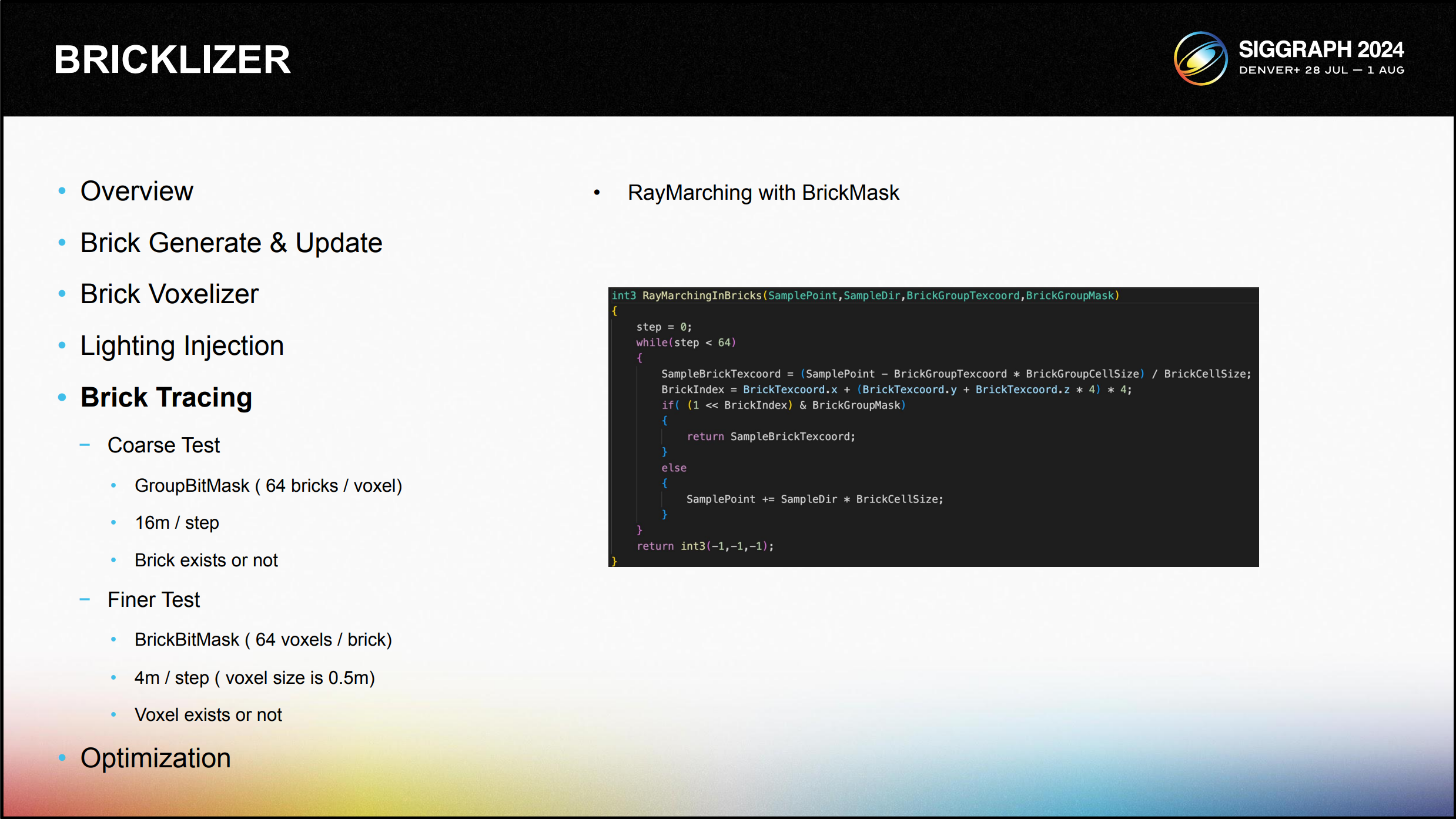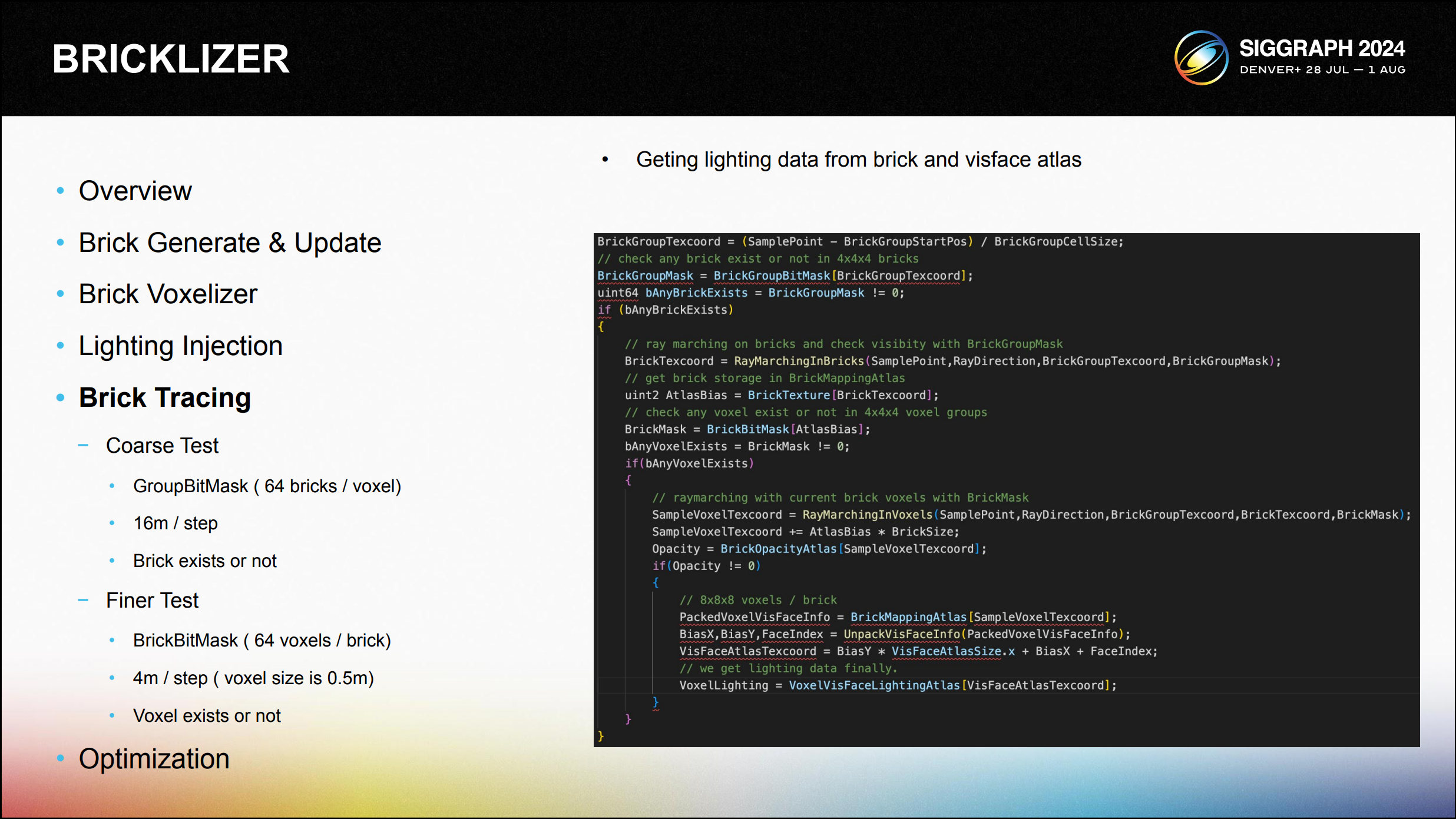 다음은 브릭과 비표면 조명 아틀라스에서 조명 데이터를 가져오는 의사 코드입니다. 첫 번째 레이마칭은 브릭 그룹 비트 마스크를 사용하여 브릭 수준에서 이루어지고, 그 다음 복셀 수준에서 레이마칭이 이루어지며, 각 레이마칭 프로세스는 64비트를 사용 하여 64개의 브릭 또는 복셀의 존재 여부를 확인합니다.