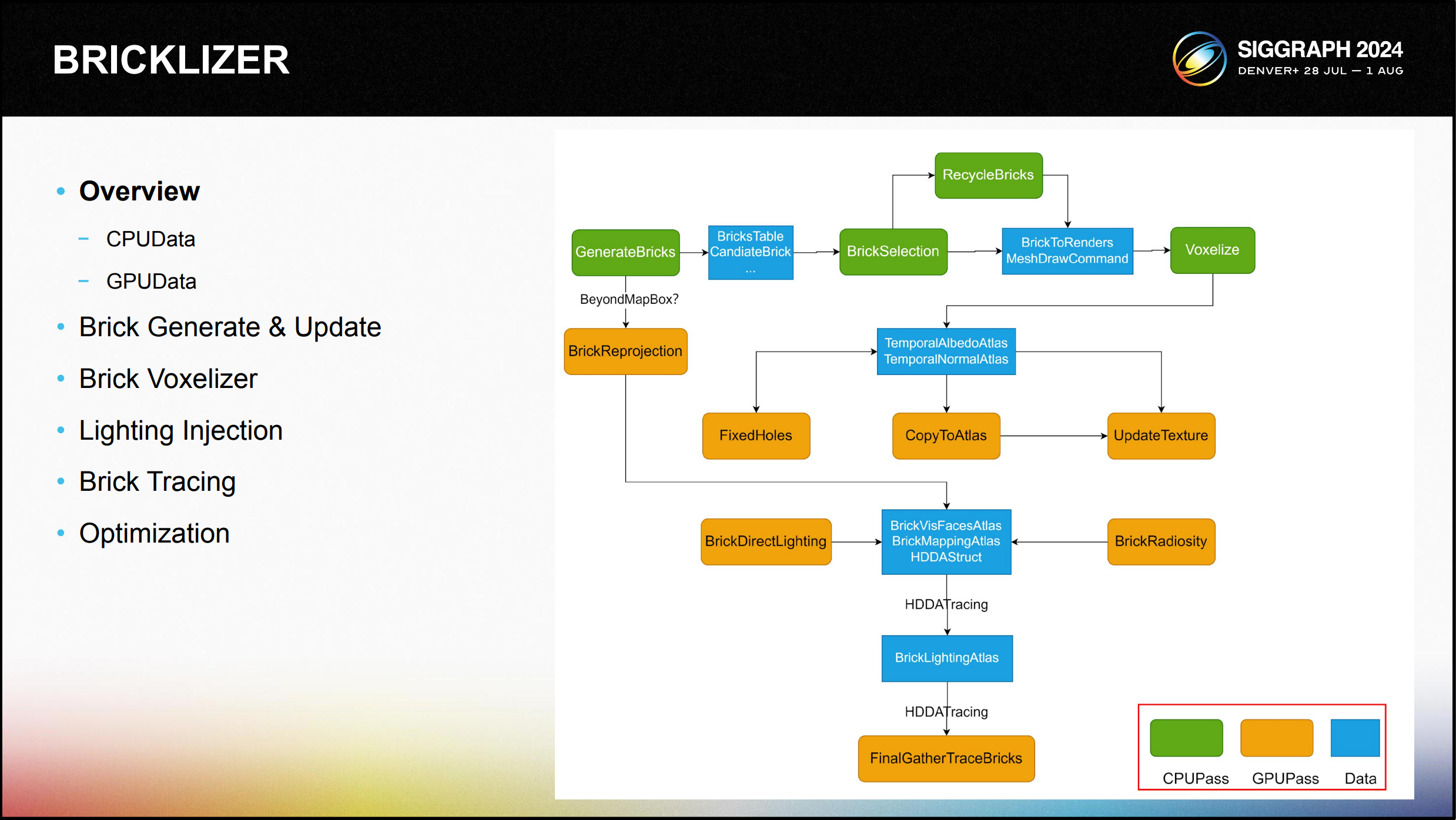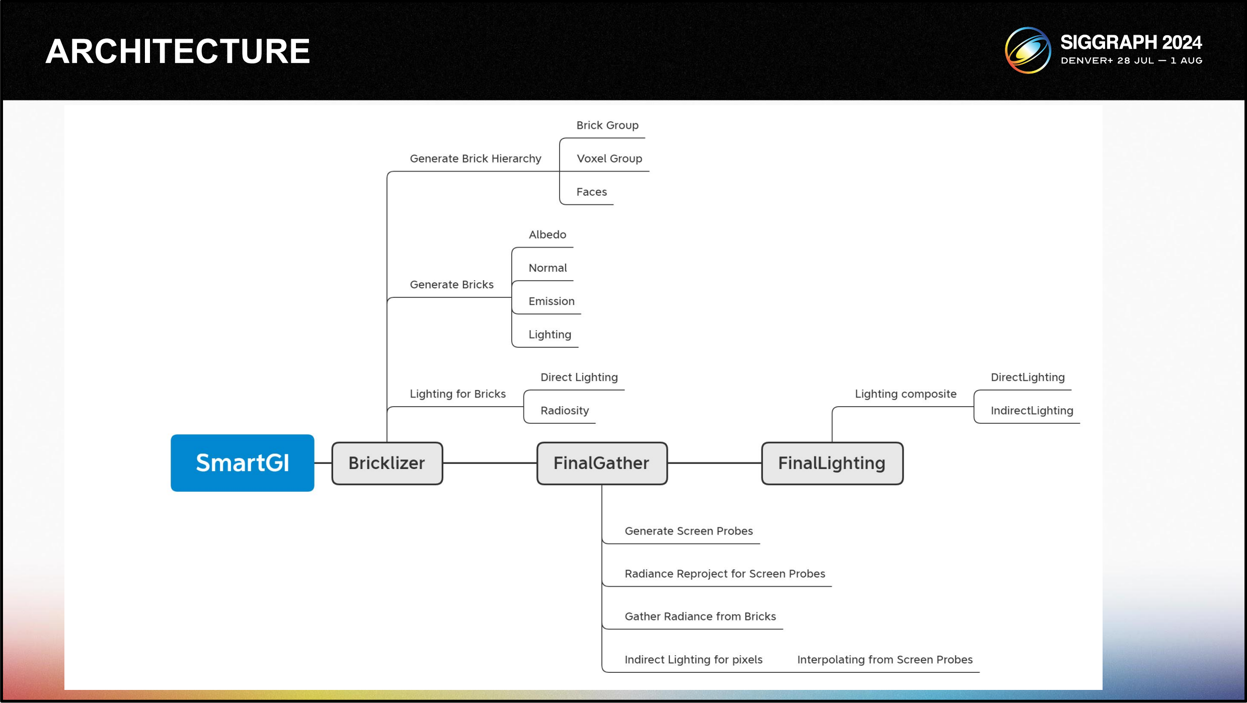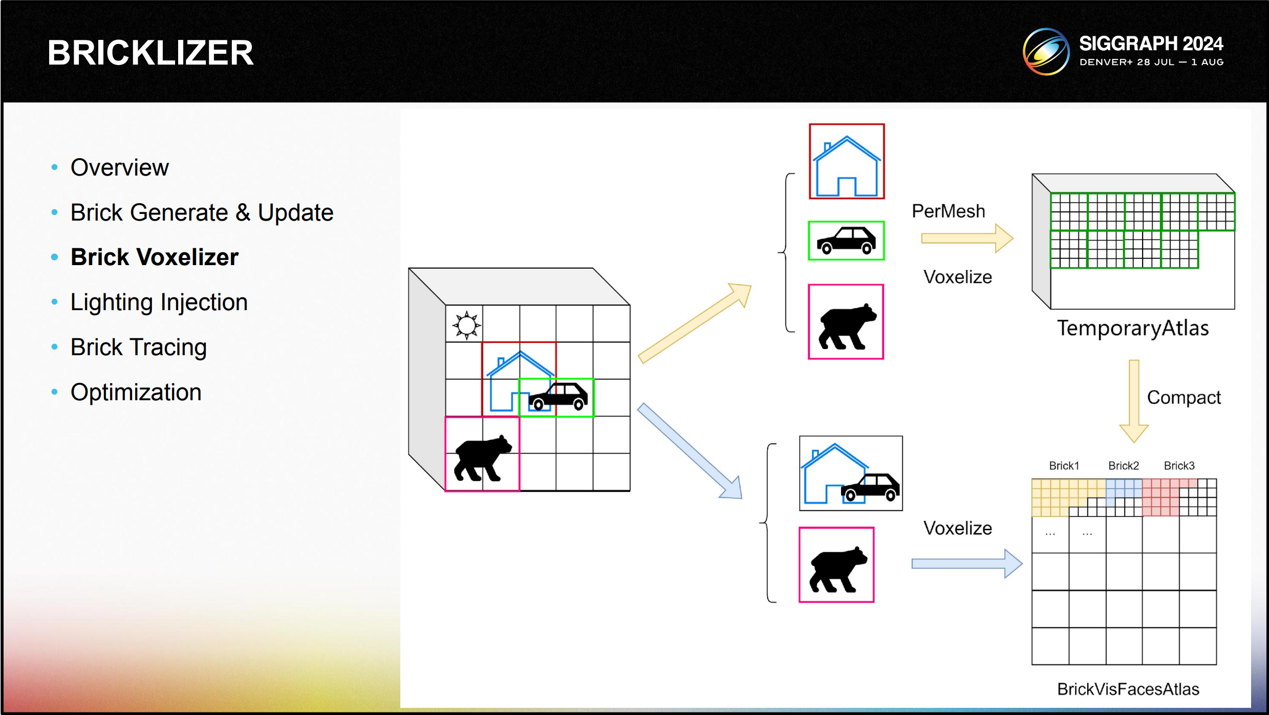 다음은 세 가지 주요 부분으로 구성된 솔루션의 전체 아키텍처 다이어그램입니다: Bricklizer , 파이널개더, 라이팅 컴포지션입니다. Bricklizer는 계층적 복셀화를 달성하 기 위한 우리의 접근 방식입니다.