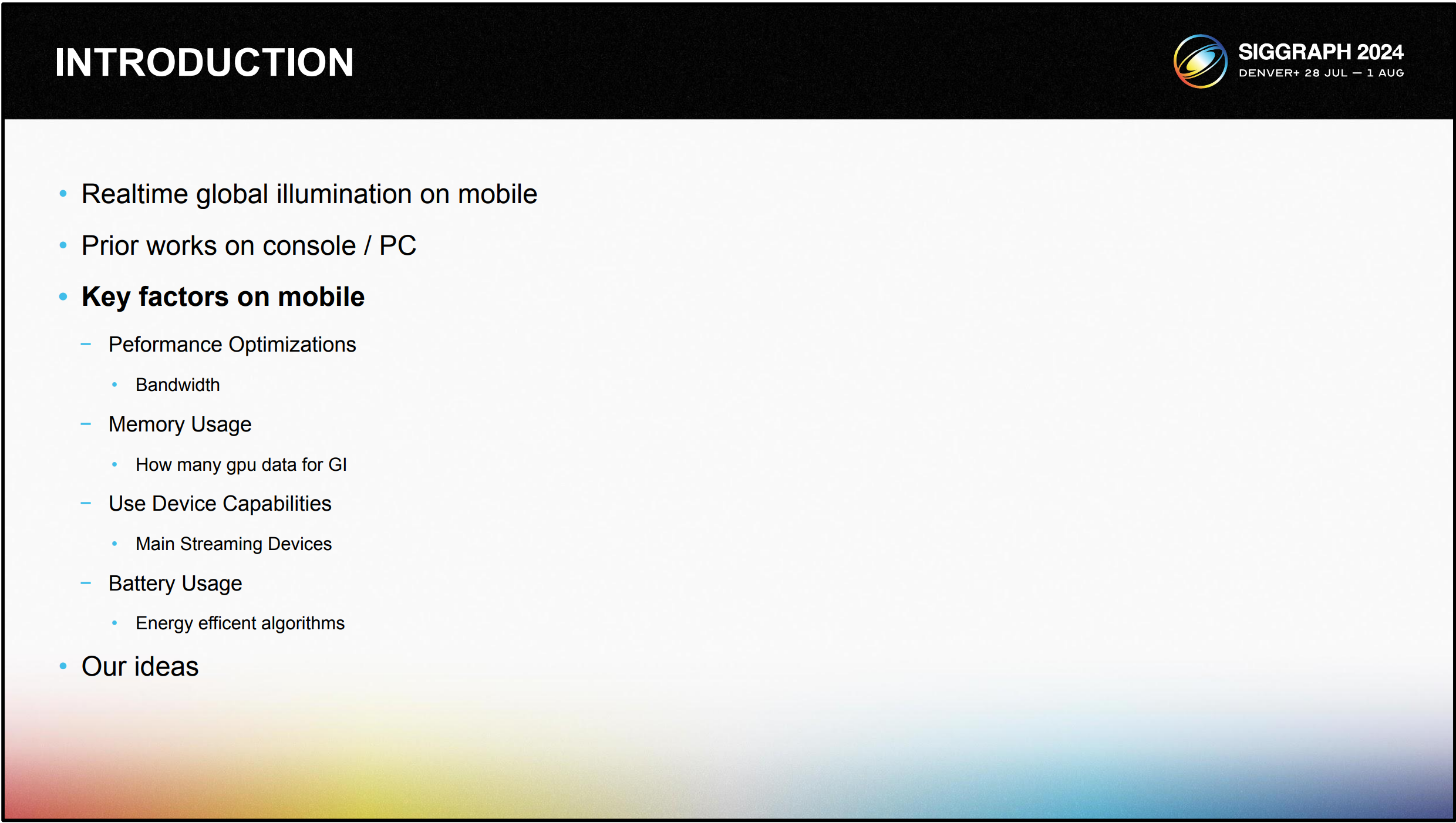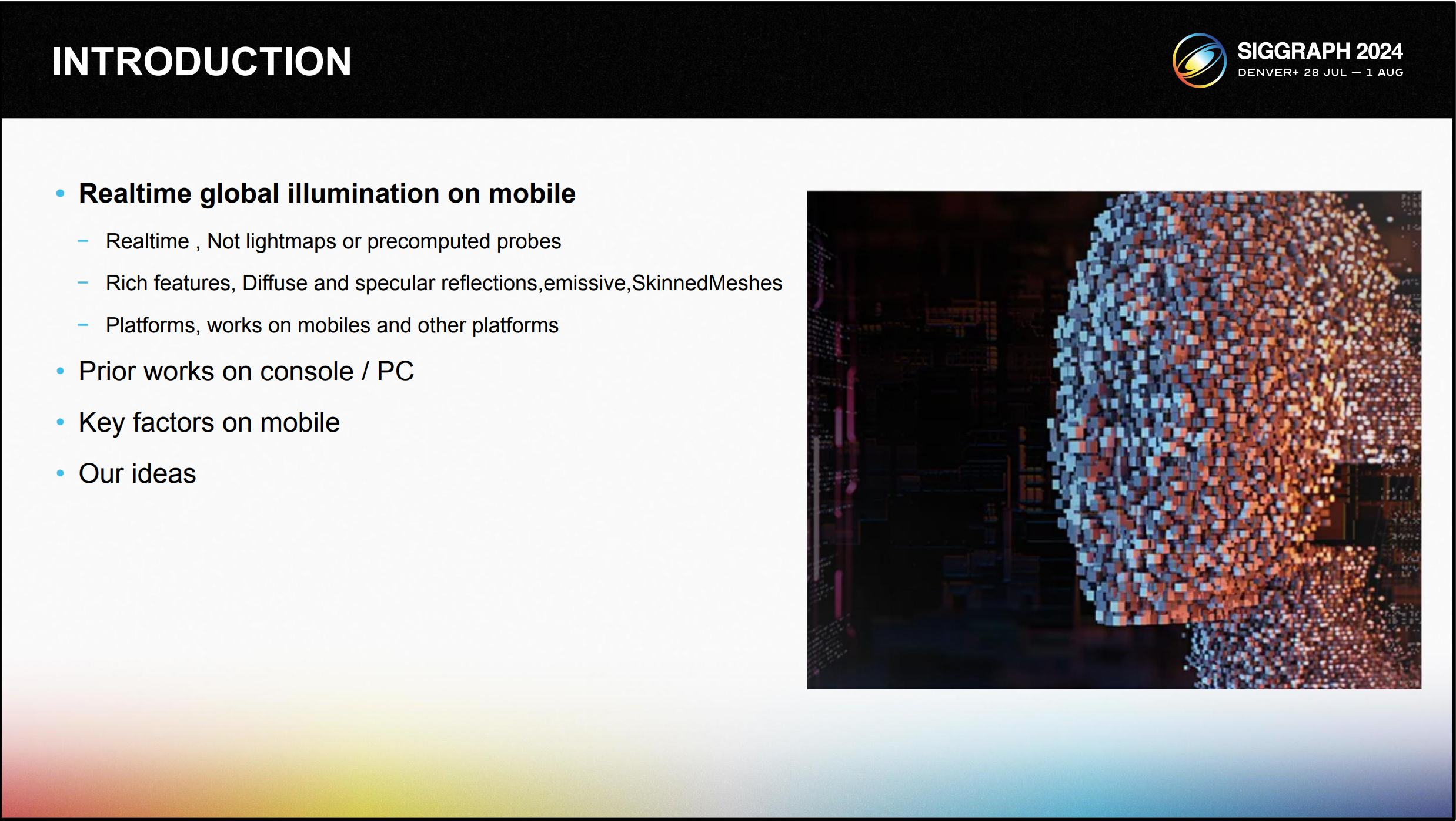 제시 바커(Jesse Barker)가 모더레이터가 되어 다시 돌아오게 되어 기쁩니다. 올해 우리는 물리적 기반의 음영, 전역 조명 및 올해 처음으로 신경 그래픽 기술이 어떻게 모바일에 적용될 수 있는지 살펴봅니다. 또한 그래픽 스택의 현대화와 이를 통해 얻을 수 있는 이점에 대해 논의할 것입니다.
