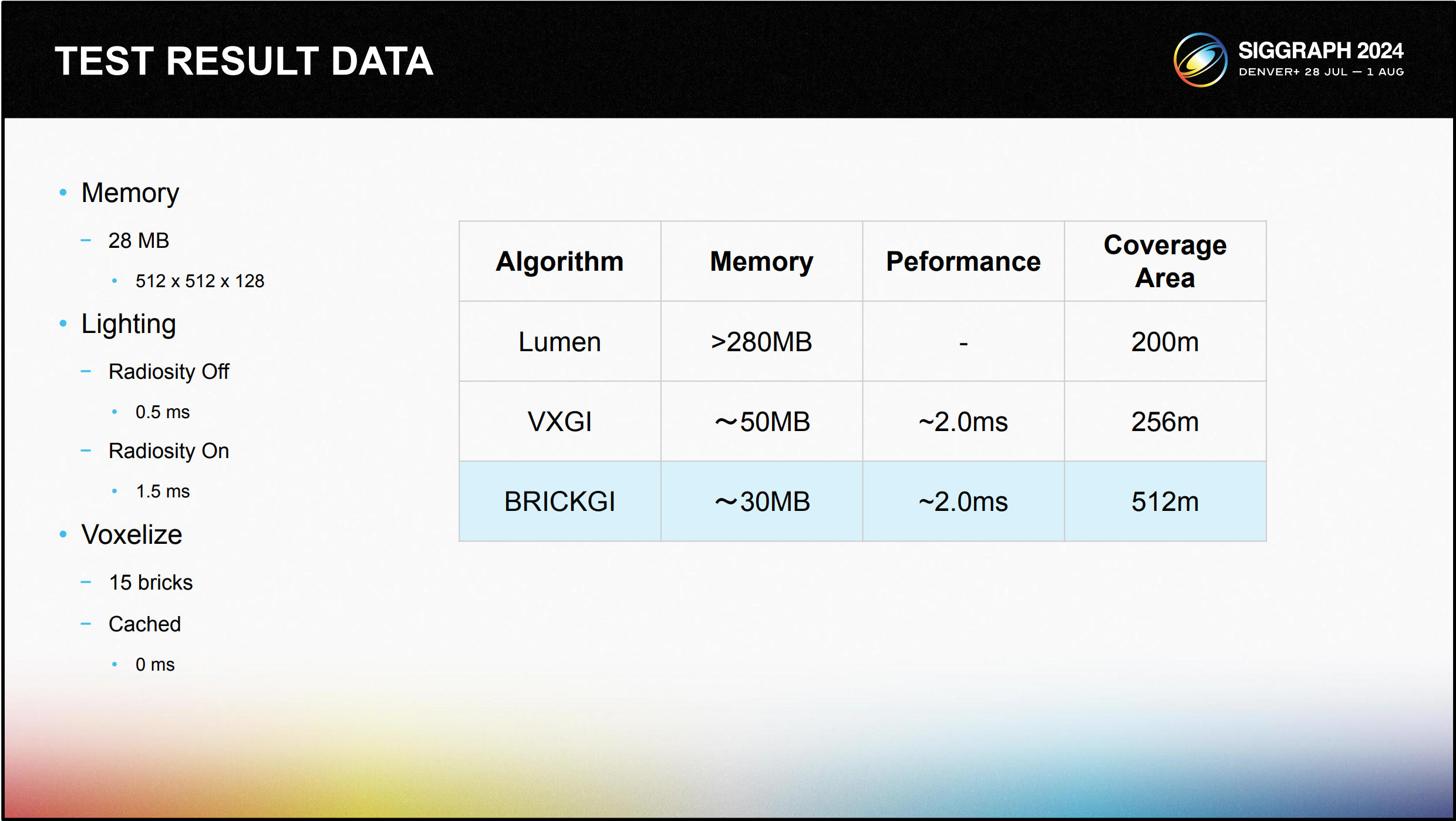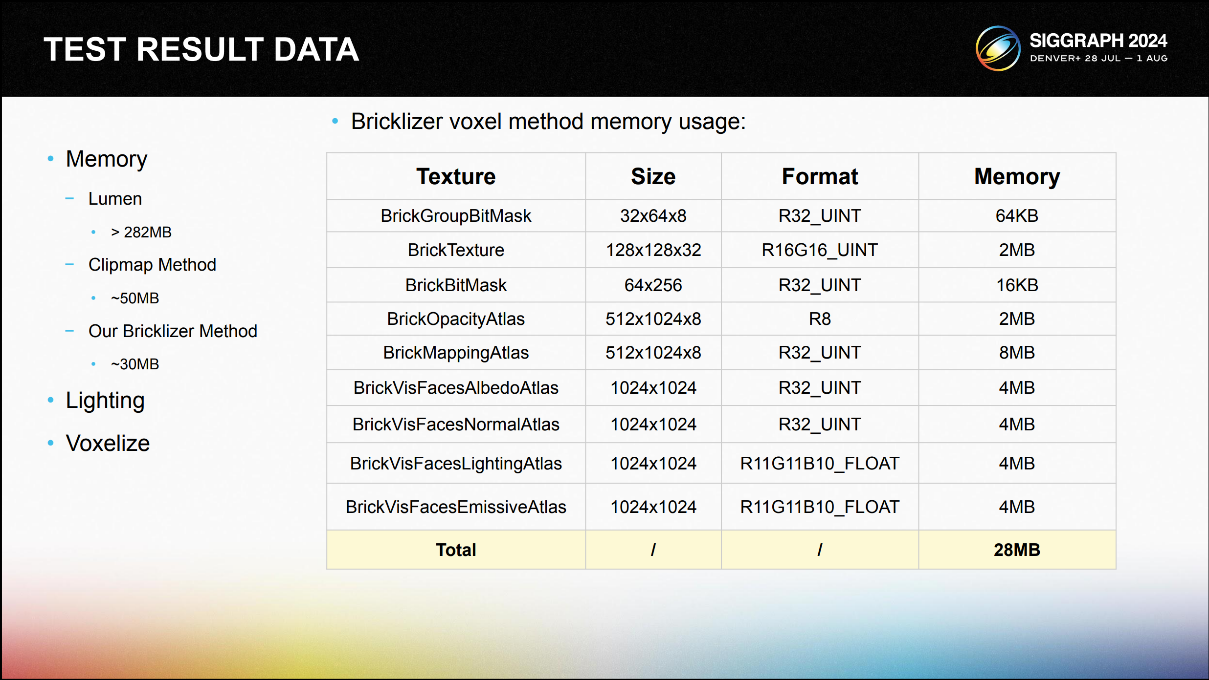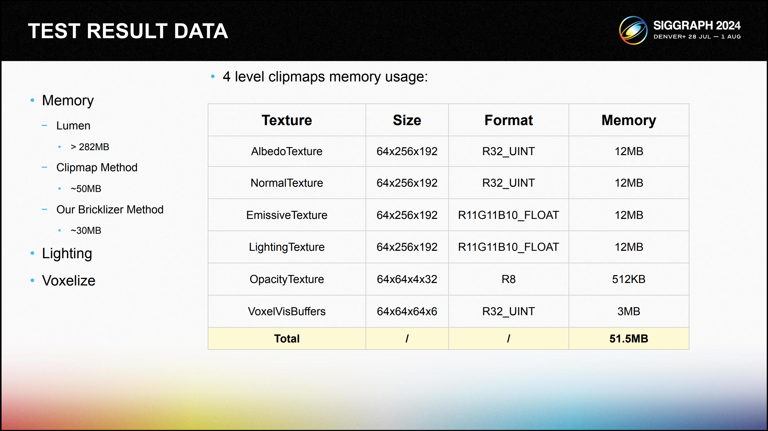 최신 브릭라이저 기술을 기반으로 한 복셀화 방법의 자세한 메모리 사용량은 다음과 같습니다. 약 30MB의 메모리를 사용하며 장면 범위는 4레벨 클립맵의 두 배인 최대 512미터에 이릅니다.