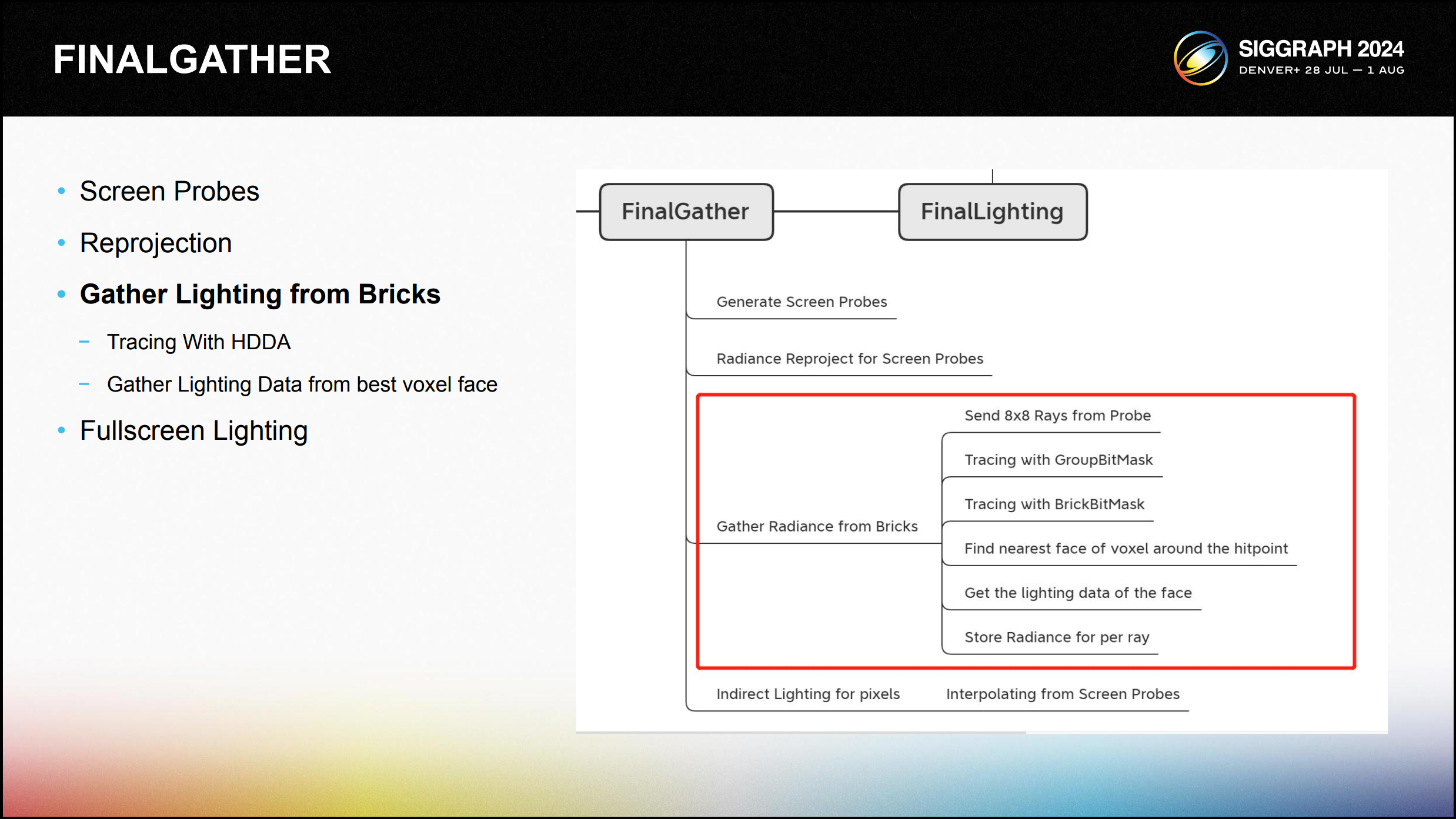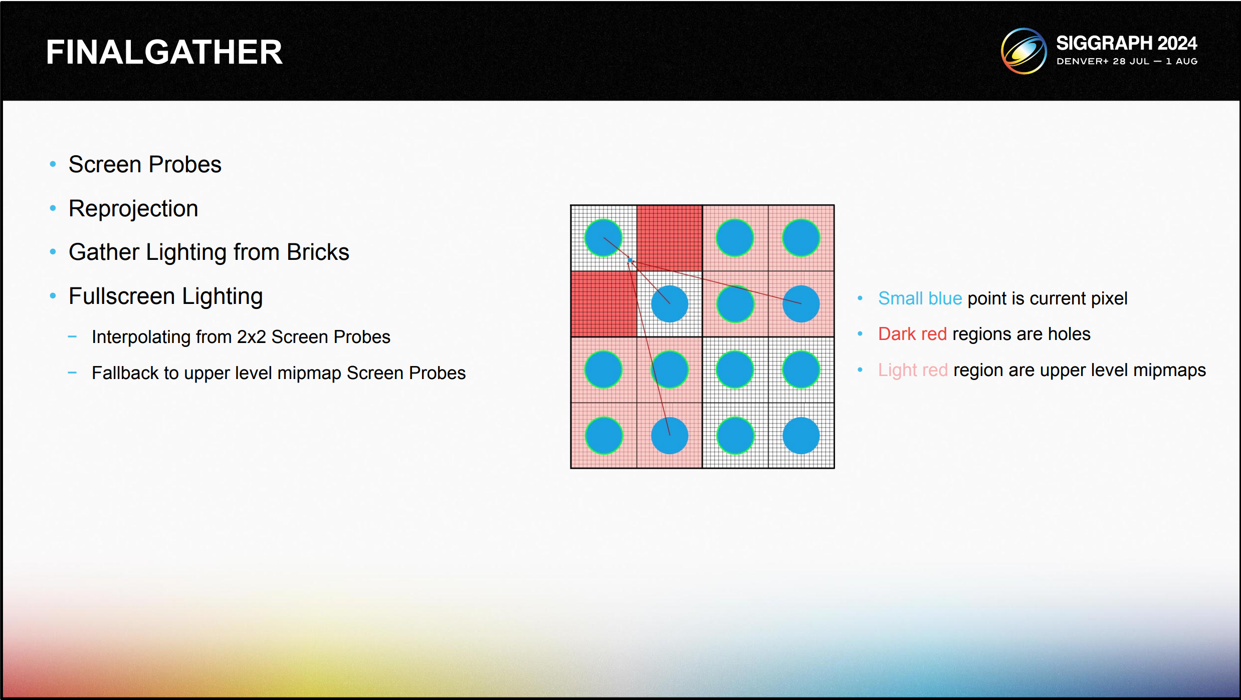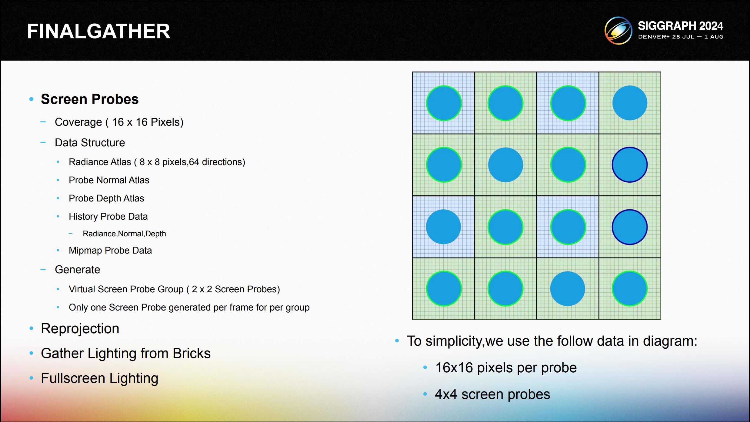 FinalGather는 스크린 프로브를 기반으로 조명을 수집하고 스크린 프로브의 광원 정보에서 각 픽셀 셰이딩에 대한 조명을 보간하는 프로 세스입니다.