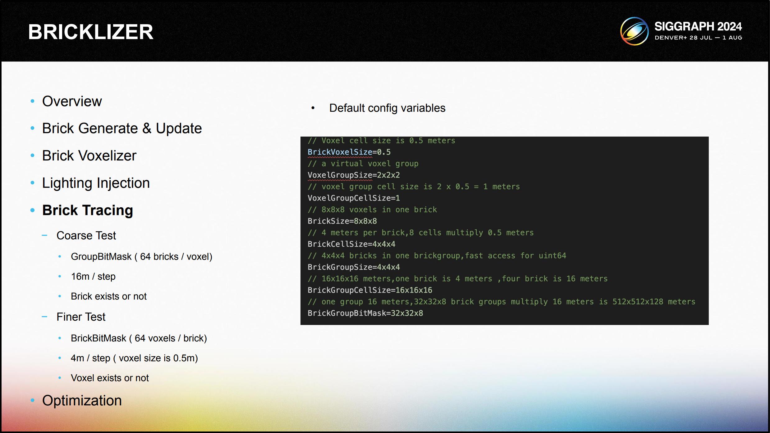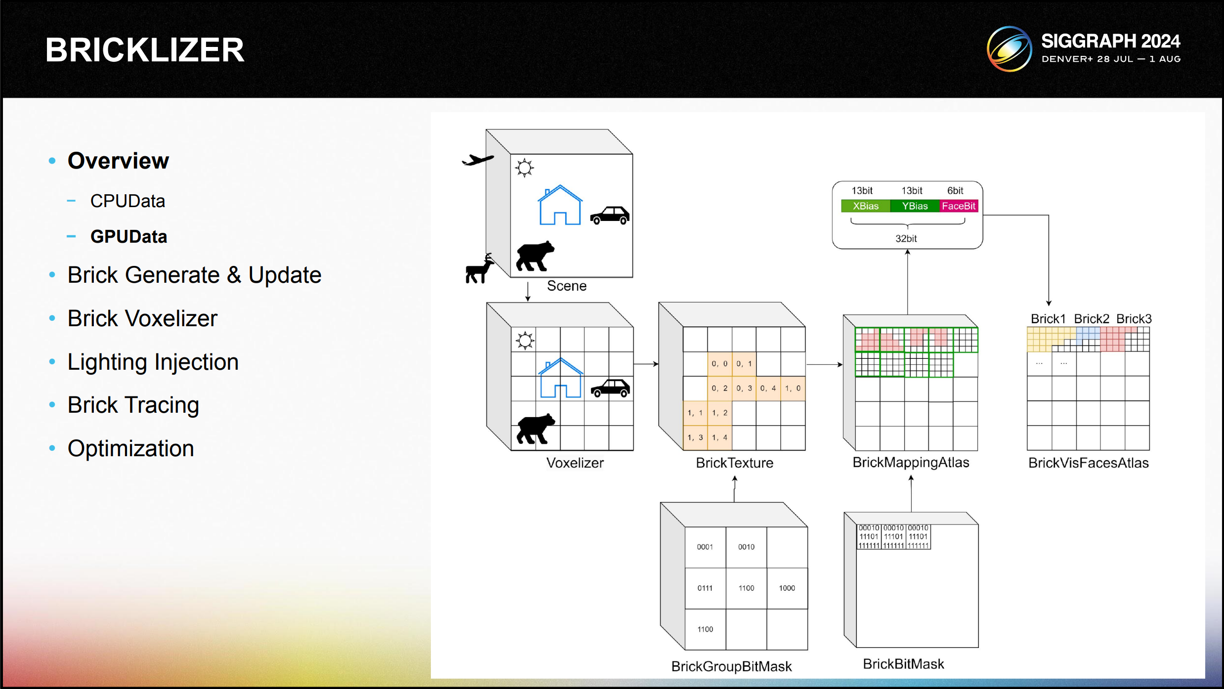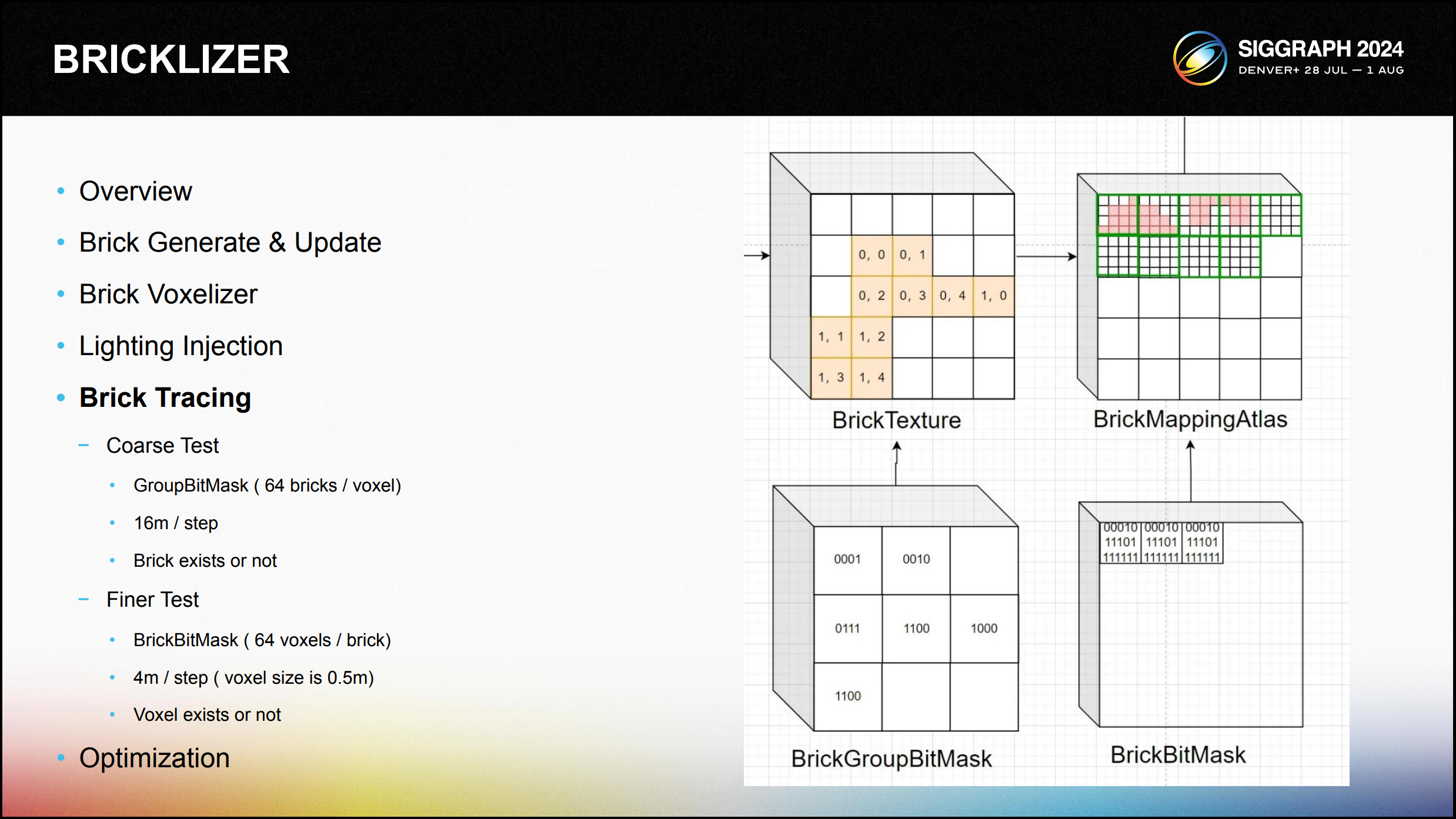 그 중 BrickGroupTexture는 4x4x4 브릭을 컴포지션 단위로 사용하며, 각 그리드에는 브릭의 유무를 나타내는 데 사용되는 64비트 비트마 스크가 저장되어 있습니다. 마찬가지로 BrickBitMask는 BitMask를 사용하여 해당 복 셀의 유무를 나타냅니다.