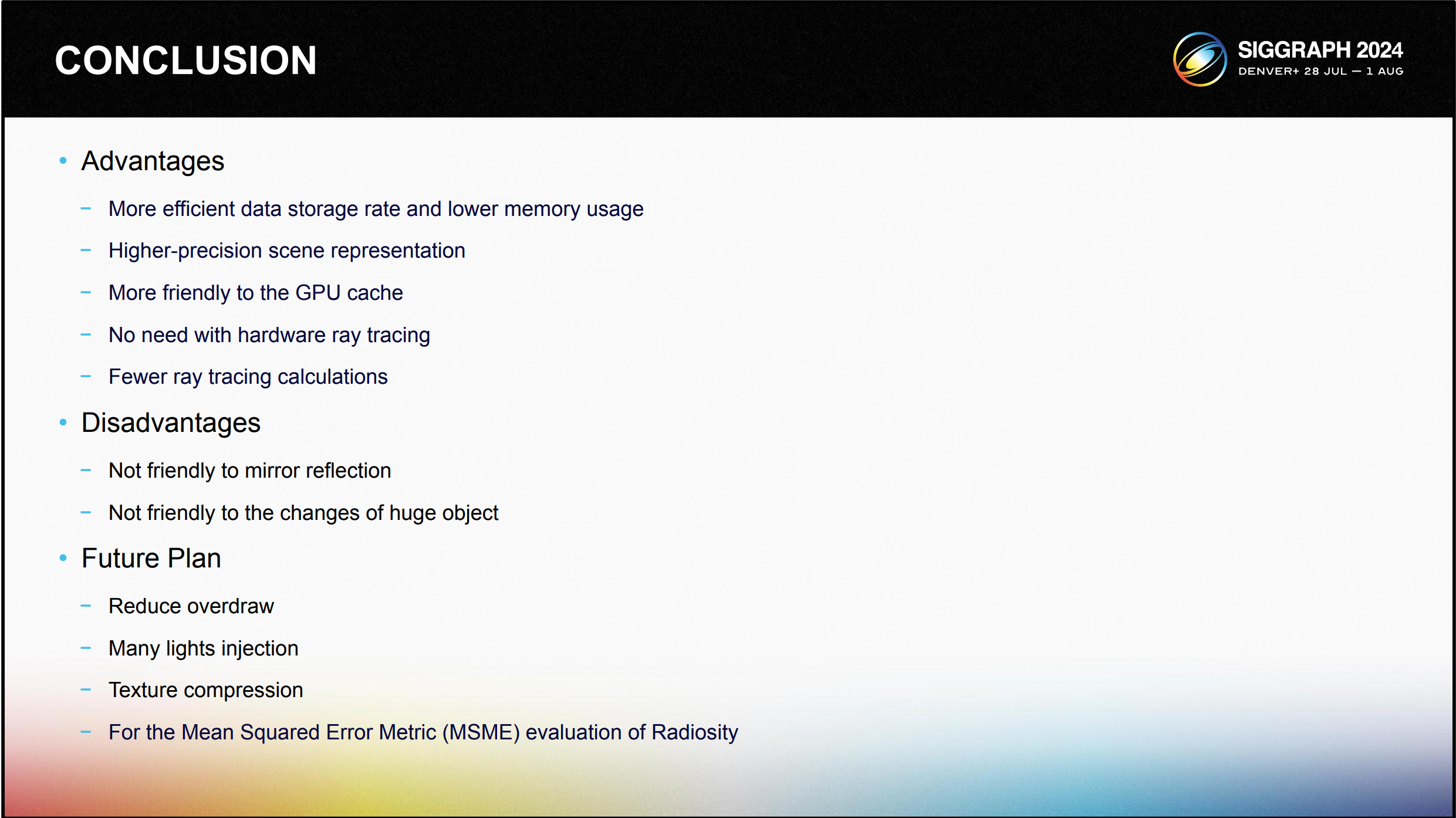 이 시스템의 장점은 데이터 저장 속도가 더 효율적이어서 메모리 사용량이 줄어들어 장면을 더 정밀하게 표현할 수 있다는 점입니다. 또한 GPU 캐시와 더 잘 호환되도록 설계되어 하드웨어 기반 레이 트레이싱이 필요하지 않으므로 필요한 레이 트레이싱 계산 횟수를 줄일 수 있습니다. 하지만 거울 반사를 효과적으로 처리하지 못한다는 점과 거대한 물체의 변화에 적응하기 어렵다는 단점도 있습니다. 앞으로 우리는 오버드로를 줄이고, 여러 광원 주입을 통합하고, 텍스처를 압축하는 전략을 구현할 계획입니다. 이러한 개선 사항은 평균 제곱 오차 지표(MSME)를 사용하여 방사도를 평가할 때 특히 유용하며, 성능과 정확도를 모두 개선하는 것을 목표로 합니다.