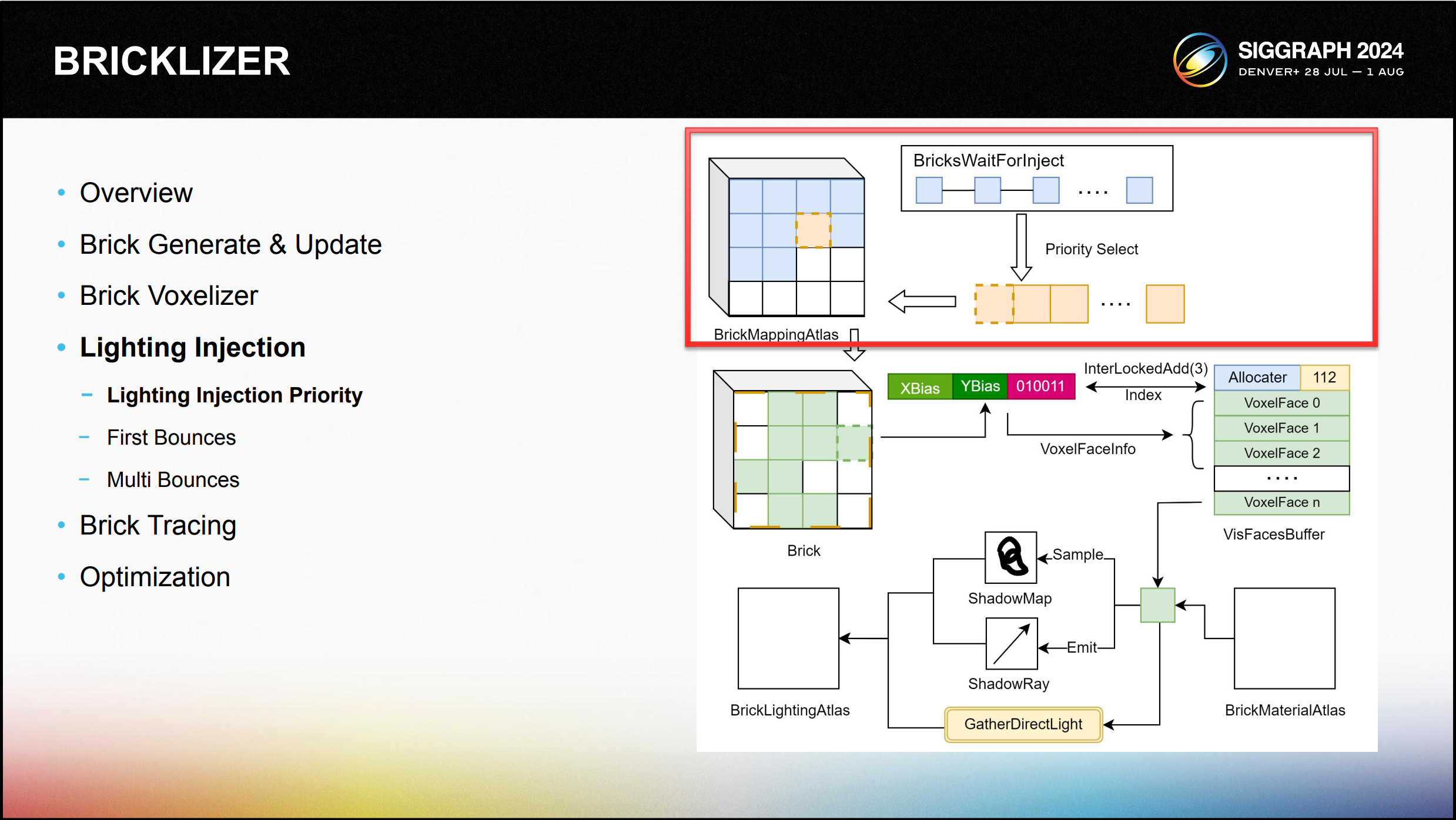 조명 계산은 처리를 위해 직접 조명과 간접 조명의 두 부분으로 나눌 수 있습니다. 각 프레임에 대한 직접 조명을 계산하기 전에 후보 목록에서 직접 조명 계산을 수행할 k 개의 브릭을 선택합니다. 선택은 뷰 프러스텀 내 위치 또는 카메라와의 거리와 같은 정 렬 요소를 기반으로 할 수 있습니다.