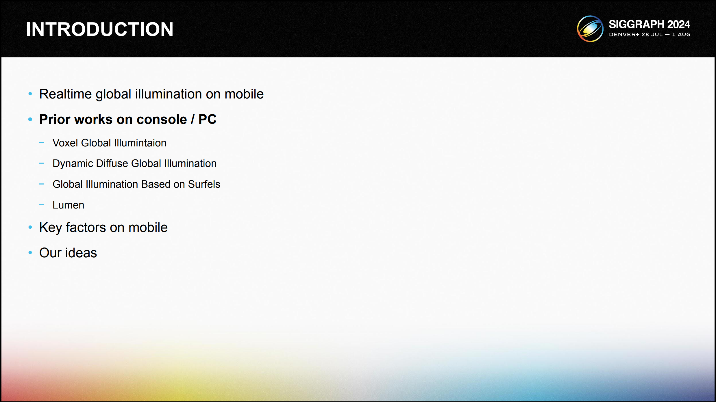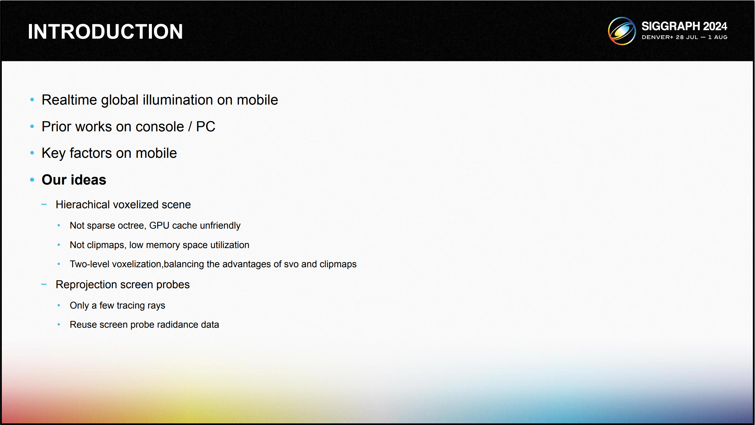 역자의 말. 2023년 리얼타임 렌더링 세션 내용도 대부분 주석번역을 하면서 "아~ 그렇구나" 하고 배울 것들과 더욱 더 깊이 탐색 해 봐야할 것들에 대한 리스트업을 했던 것이 벌써 1년이 지났습니다. 이번 소개글은 텐센트에서 발표 한 내용으로 모바일 하드웨어에서의 글로벌 일루미네이션 처리 방안에 대한 것이구요. 혹여 기억이 나실지 모르겠습니다만... AMD 랩에서 진행했던 브릭셀라이저와 단어가 많이 겹치는 부분이 있네요.