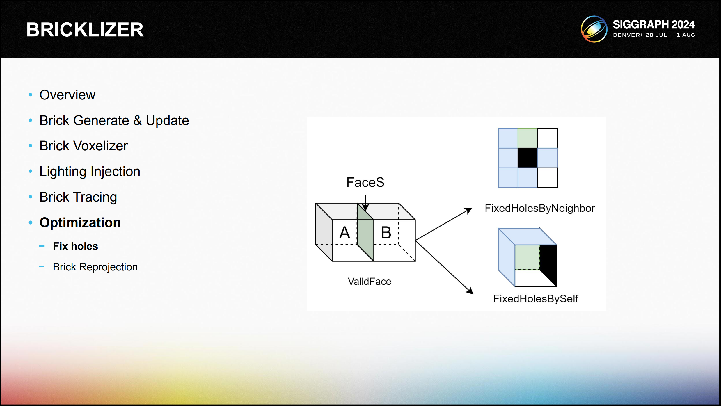 각 복셀 면의 실제 저장 캐리어는 BrickVisFacesAtlas라는 2D 아틀라스로, 모든 유효한 면(인접한 복셀이 비어 있거나 반 투명한 경우)을 밀도 있게 저장합니다.