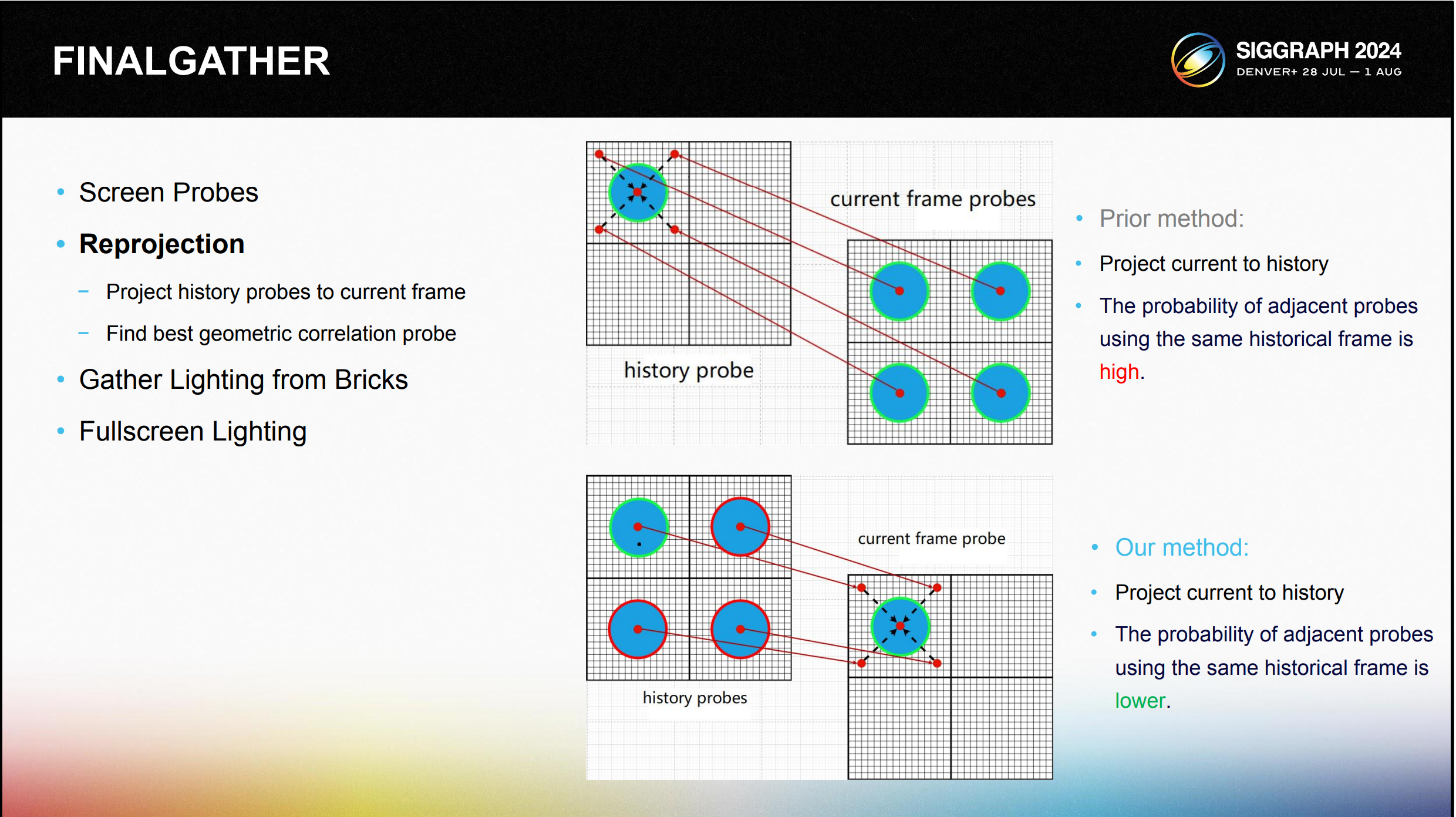 프레임당 스크린 프로브의 방사도를 계산하는 계산 비용을 더욱 줄이기 위해 과거 스크린 프로브 방사도 데이터의 활용을 극대화합니다. 현재 프레임의 스크린 프로브를 과거 프레임에 투영하여 인접한 스크린 프로브를 찾는 방식과 과거 프레임의 스크린 프로브를 현재 프레임에 재투영하고 기하학적으로 가장 가까운 과거 프레임을 사용하여 현재 프레임을 채우는 두 가지 방식이 있습니다. 이 방법은 이전 접근 방식에 비해 스크린 프로브의 충돌률이 더 낮다는 것을 발견했습니다. 재투영에 실패한 스크린 프로브의 경우 다음 단계인 복사 데이터 수집 및 계산을 진행합니다.