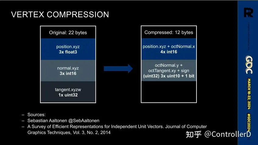 - 압축 한계, 포지션 정보는 int16, 접선 프레임은 팔면체(octahedron) 매핑을 사용합니다.
