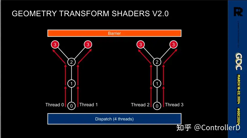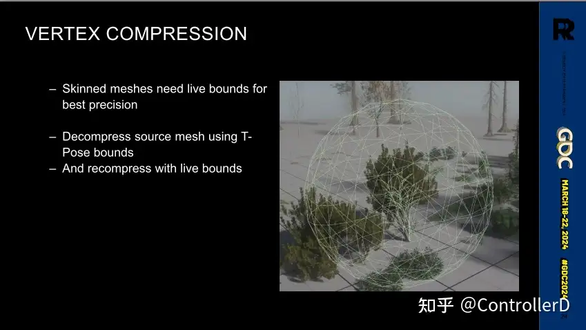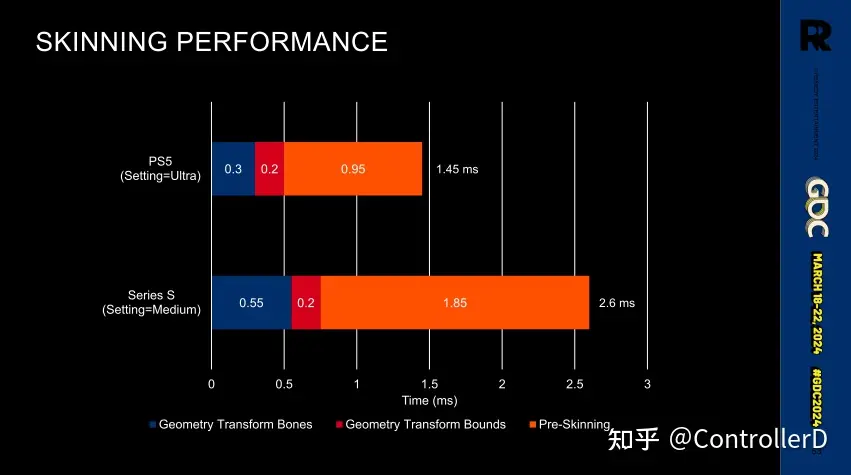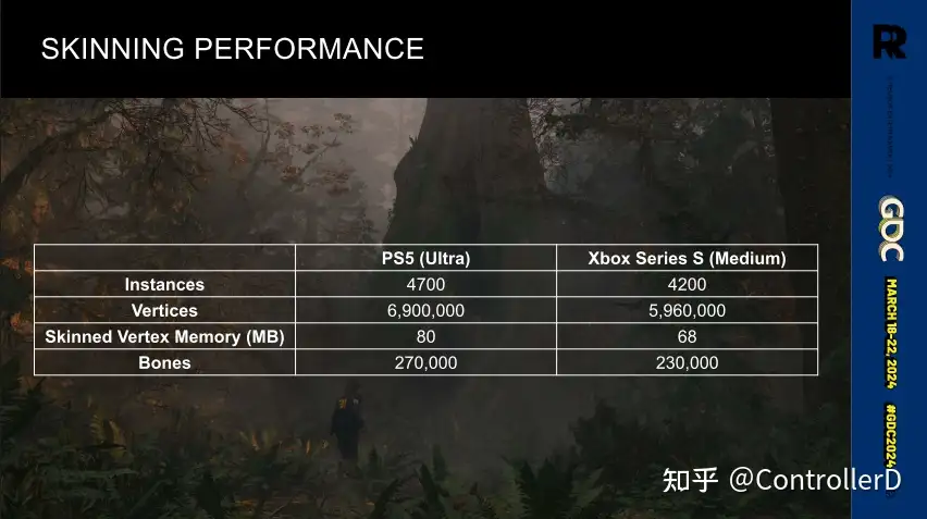 노스 라이트 엔진(레메디 독점 엔진)의 스키닝 애니메이션이 모두 컴퓨트쉐이더에서 계산 된 후 스킨 버퍼에 저장된 다음 그려지도록 변경되었으며, 컨트롤의 일부 머티리얼은 버텍스쉐이더에서 스킨화됩니다. 또한 노스 라이트가 alan awake2에서 GPU 구동으로 변경된 큰 배경이 있으며 캐릭터 메쉬조차도 클러스터입니다. 알란 어웨이크2에서 노스라이트 엔진이 GPU 구동 렌더링으로 바뀐 것도 큰 배경이 있는데, 캐릭터 메시도 클러스터이기 때문에 스키닝 과정에서 클러스터의 경계를 파악해야 합니다 컴퓨트쉐이더 스키닝은 128 버텍스의 배치, 버텍스 당 1/4/8 본 옵션입니다.