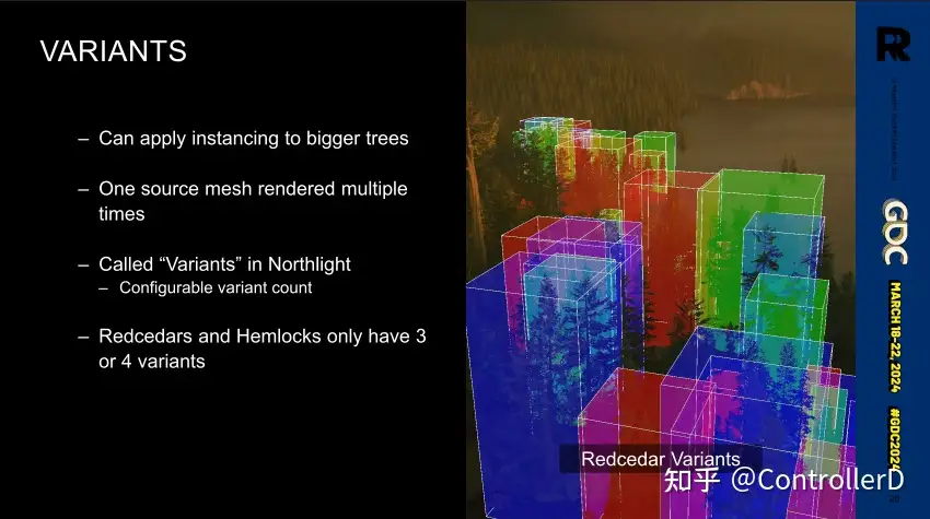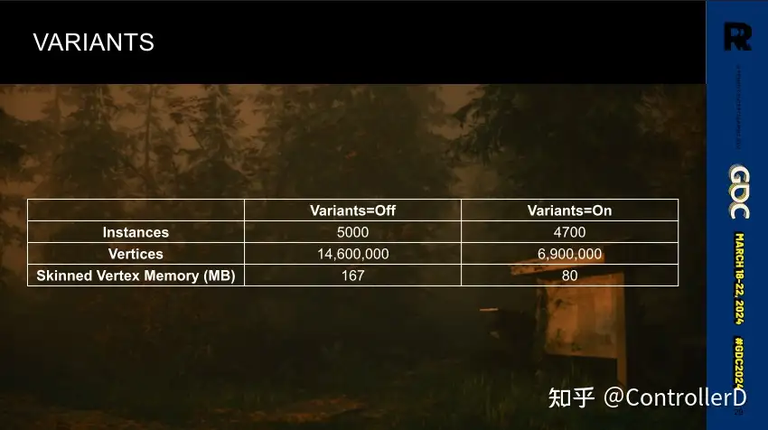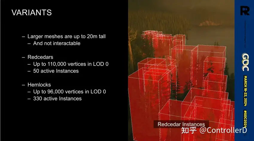 게임의 숲 장면에서 나무의 밀도가 여전히 상당히 높습니다. 주변 환경과 상호작용하지 않는(자체 애니메이션만 브로드케스팅) 키 큰 나무의 경우, 나무를 인스턴스화할 때 스킨의 결과물을 다른 위치/회전에 놓고 여러 번 그리는 소위 변형 방식을 사용했는데, 나무가 상대적으로 크고 숲에 다양한 다른 것들이 있기 때문에 쉽게 감지할 수 있기 때문이죠. 나무가 크고 숲에 다른 것들이 많기 때문에 눈에 띄기가 쉽지 않습니다.