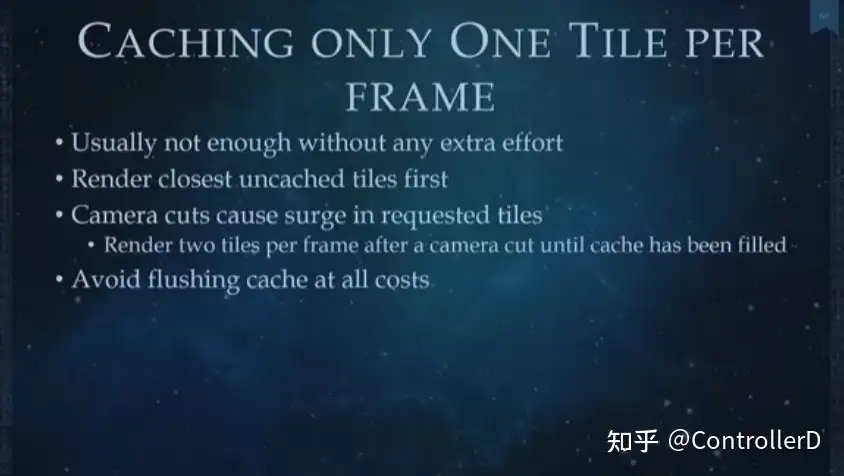 하나의 타일은 128x128m로 결코 작지 않습니다. 타일을 업데이트하려면 컬링 등의 작업이 필요하기 때문에 프레임당 하나의 타일을 사용하는 것이 전략입니다.하지만 시점이 빠르게 움직일 때는 타일 하나로는 충분하지 않기 때문에 전환할 때 카메라가 넓어집니다.