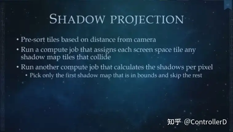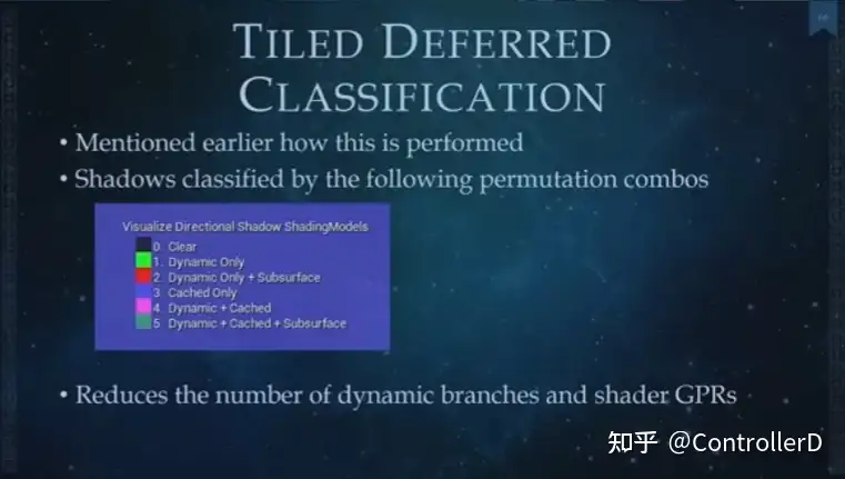 또한 타일 디퍼드의 분류 패스에서 각 화면 타일에 대해 샘플링할 그림자 유형도 고려해야 한다고 언급했습니다.이 두 가지를 사용하면 모든 픽셀이 동적 참조 또는 캐시된 섀도 케이스만 선택하도록 하여 분기를 사용하지 않는 gpu program variant 를 완전히 삭제하여 VGPR 사용을 줄일 수 있습니다.
