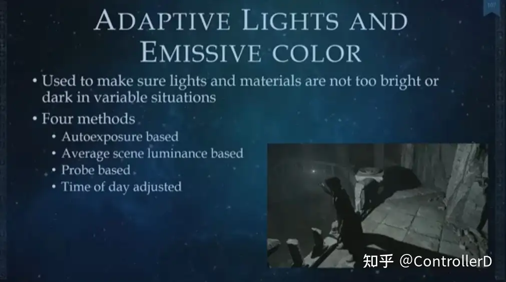 마지막으로 렌더링된 프레임의 평균 밝기를 기준으로 사용하면 많은 문제가 발생할 수 있습니다. 예를 들어 카메라가 시야각 조명을 차단할 때, 전후 두 프레임의 밝기가 너무 많이 변하는 경우 등이 있습니다.