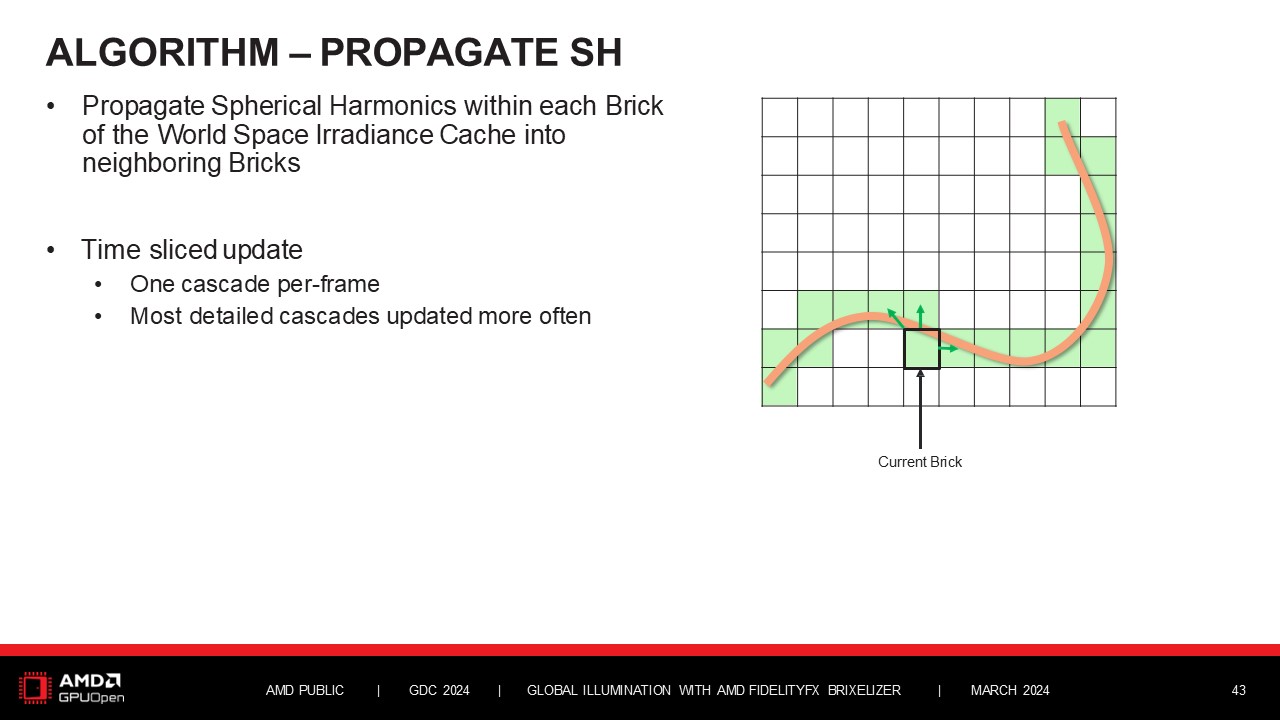 따라서 이 패스에서는 각 브릭의 구형 고조파 프로브의 조도를 인접 브릭으로 전파합니다. 이는 시간 분할 업데이트이므로 프레임당 하나의 캐스케이드를 업데이트하고 가장 세부적인 캐스케이드가 더 자주 업데이트됩니다.