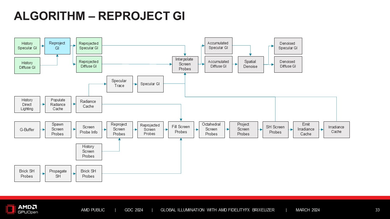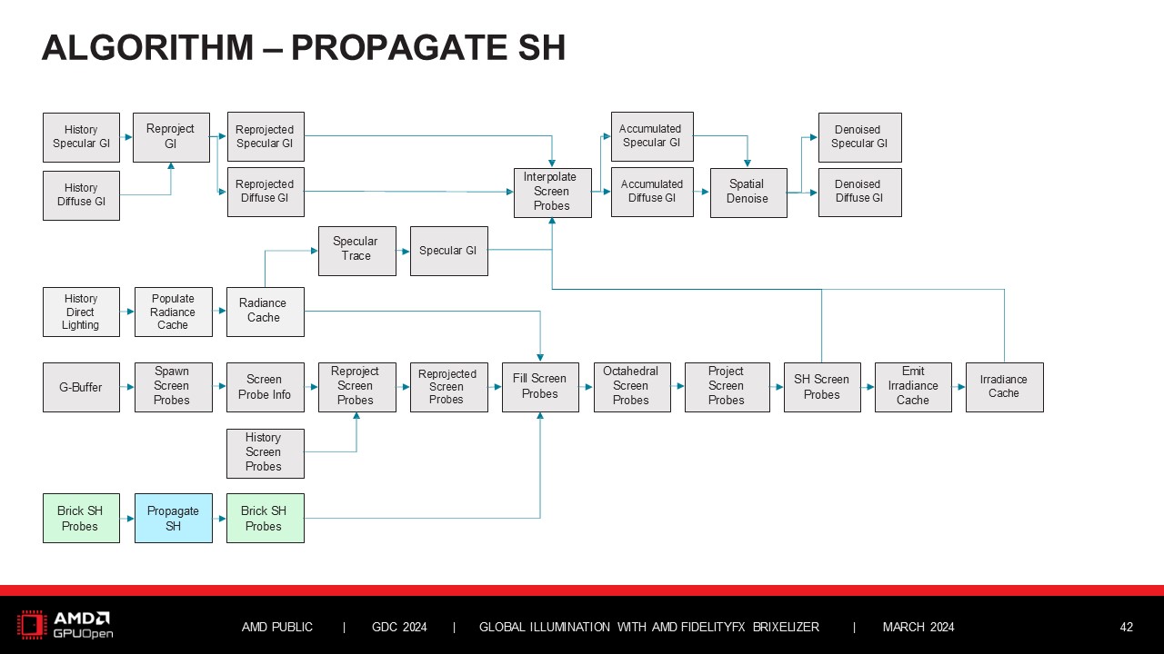 따라서 Brixelizer GI는 캡사이신 프레임워크와 함께 제공되는 AMD의 GI 1.0 알고리즘을 훨씬 더 단순화한 구현입니다. 마찬가지로 화면 공간 프로브도 사용하며, 이는 월드 스페이스 방사 및 조도 캐시에 의해 뒷받침됩니다.