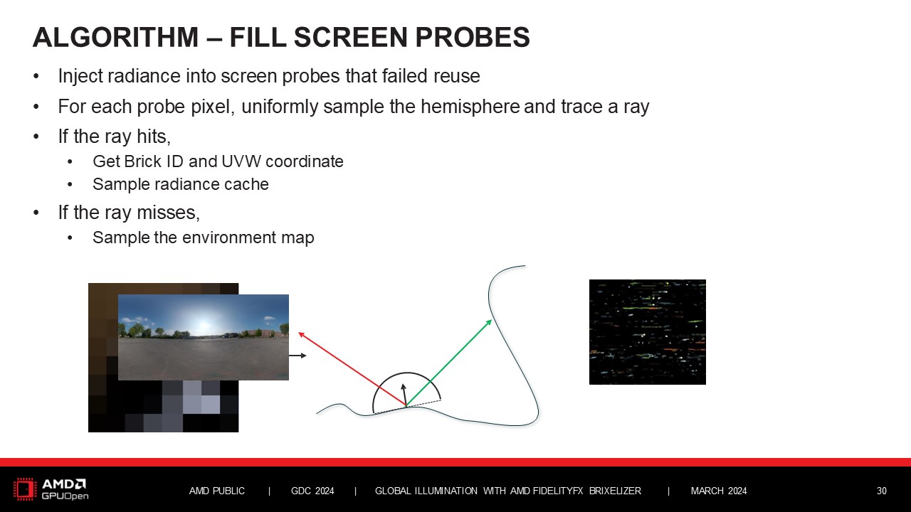 새로 생성된 프로브가 지난 프레임의 프로브를 재사용하지 못하면 새로운 광원을 주입합니다. 각 프로브 픽셀에 대해 반구를 균일하게 샘플링하고 Brixelizer를 사용하여 광선을 추적합니다. 광선이 맞으면 브릭 ID와 UVW 좌표를 사용하여 광원 캐시를 샘플링하고, 광선을 놓치면 그냥 환경 맵을 샘플링합니다.