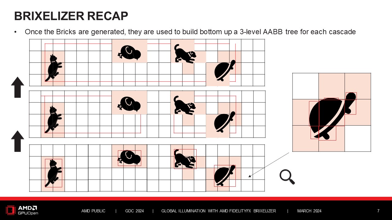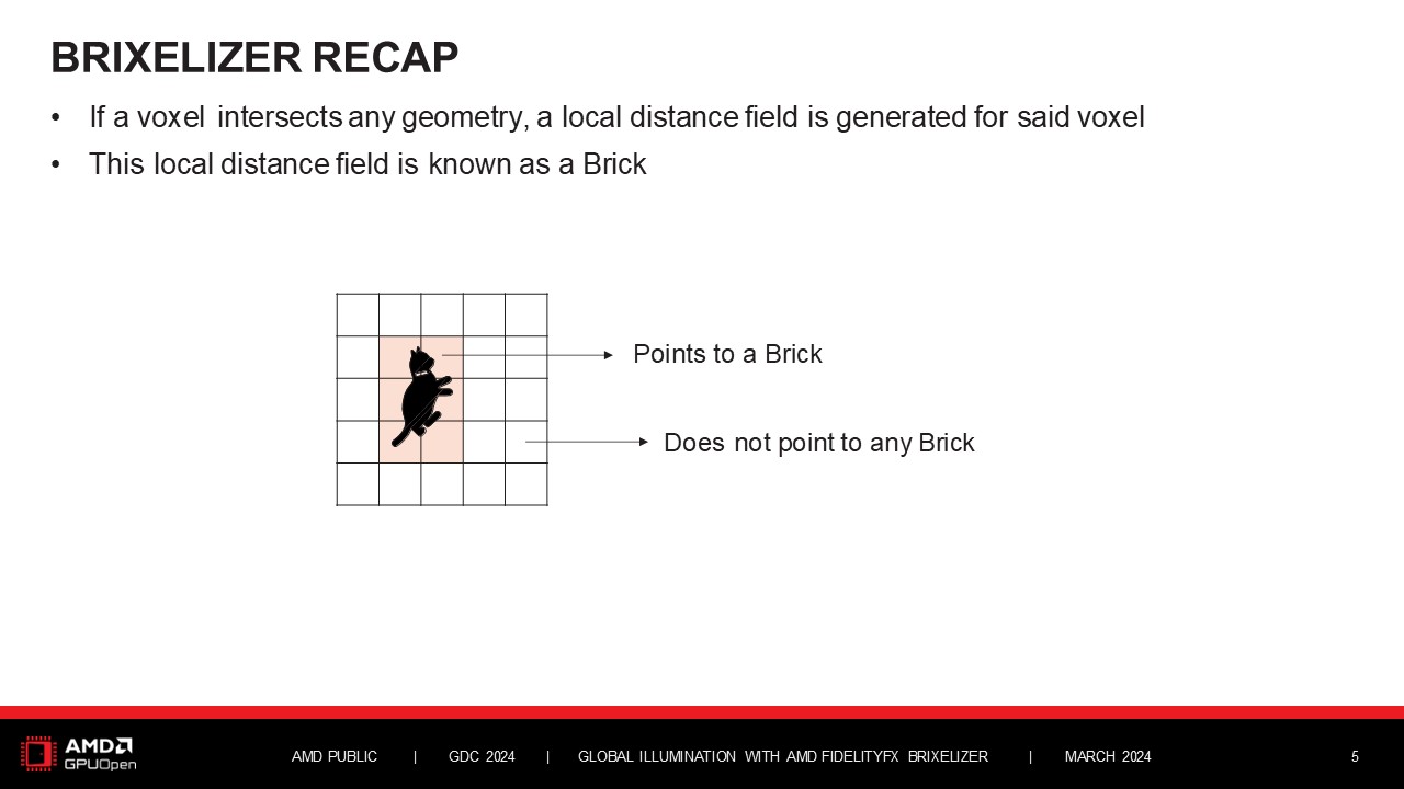 Brixelizer는 씬에 대한 광선을 효율적으로 추적하기 위해 트라이앵글 지오메트리에 대한 희소 거리 필드를 실시간으로 생성하는 FidelityFX 라이브러리입니다. 정적 및 동적 지오메트리 모두에서 작동하며 거리 필드에 대해 광선을 추적하는 셰이더 API를 제공하며, 향후 출시될 FidelityFX SDK에서 사용할 수 있게 됩니다.