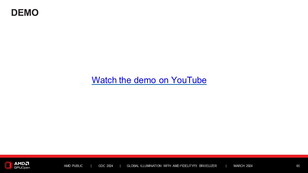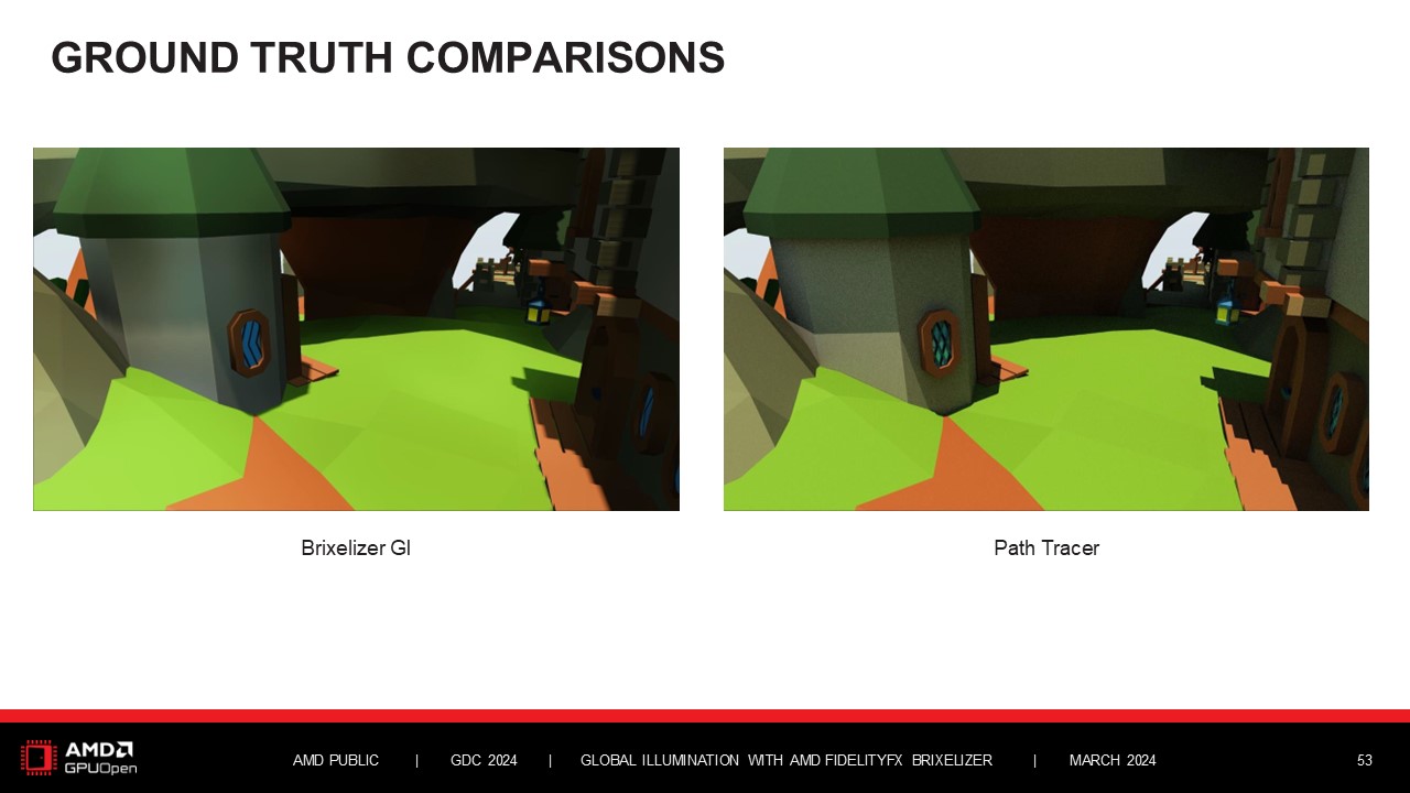 결론적으로 브리셀라이저 GI는 저사양 플랫폼에서 레이 트레이싱 글로벌 조명을 위한 대체 라이브러리입니다. G-버퍼와 직접 조명을 입력으로 받아 디퓨즈 및 스페큘러 GI를 출력합니다. 하드웨어 가속 레이 트레이싱 지원이 필요하지 않으며 DirectX 12와 벌칸 모두에서 작동합니다. 또한 MIT 라이선스를 통해 완전히 오픈 소스이며 FidelityFX SDK 버전 1.1에서 사용할 수 있습니다. 마지막으로 필요한 경우 고급 GI 솔루션의 기반이 될 수도 있습니다.