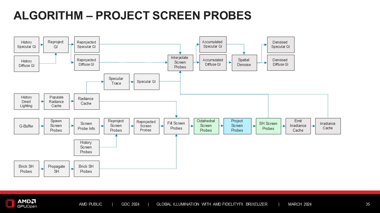 먼저 G-버퍼 표면에 스크린 프로브를 스폰합니다. 그런 다음 스크린 프로브에서 확산 광선을 추적하고 셰이딩을 위해 방사 캐시를 샘플링합니다. 그런 다음 방금 업데이트한 스크린 프로브를 사용하여 월드 스페이스 방사 캐시를 공급합니다. 그 후 G-버퍼에서 정반사 광선을 추적하고 다시 셰이딩을 위해 방사 캐시에서 샘플링합니다. 마지막으로 스크린 프로브와 방사 캐시를 사용하여 확산 GI를 해결합니다.