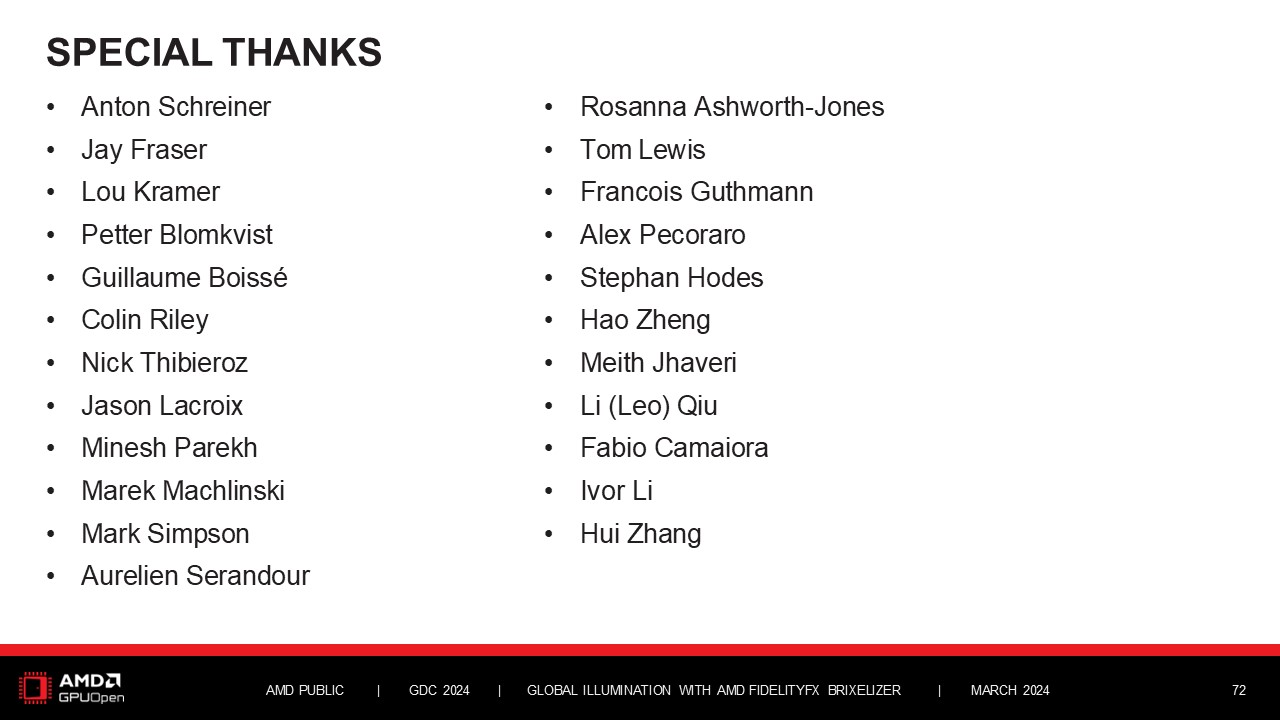 Brixelizer GI와 FidelityFX SDK에 기여해 주신 AMD의 이 분들께 특별히 감사드립니다.