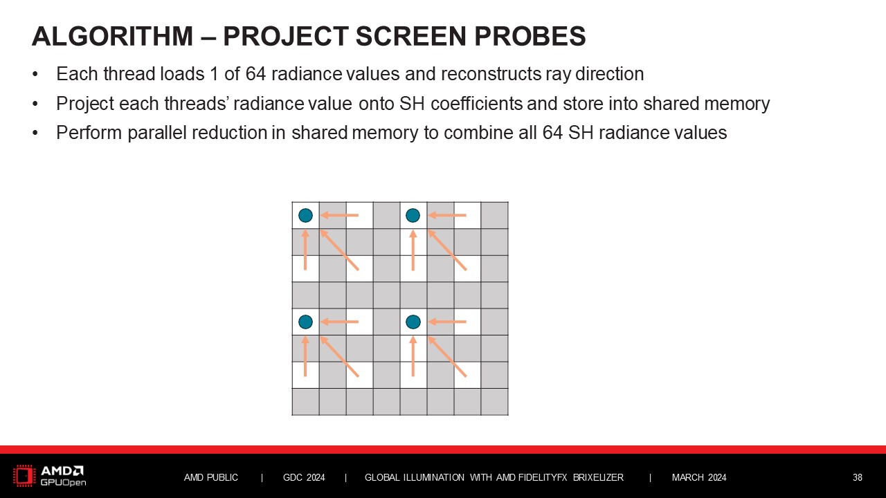 각 스레드는 스크린 프로브의 해당 텍셀의 복사 값을 로드하고 광선 방향을 재구성합니다. 그런 다음 복사 값을 SH 계수에 투영하고 공유 메모리에 저장합니다. 마지막으로 공유 메모리에서 병렬 감소를 수행하여 64개의 복사 값을 모두 결합합니다. 이는 각 활성 스레드가 3개의 인접 복사 값을 결합하여 세 번의 반복을 통해 수행됩니다. 첫 번째 반복은 각 스레드 간 간격이 2인 4x4 스레드를 사용합니다.