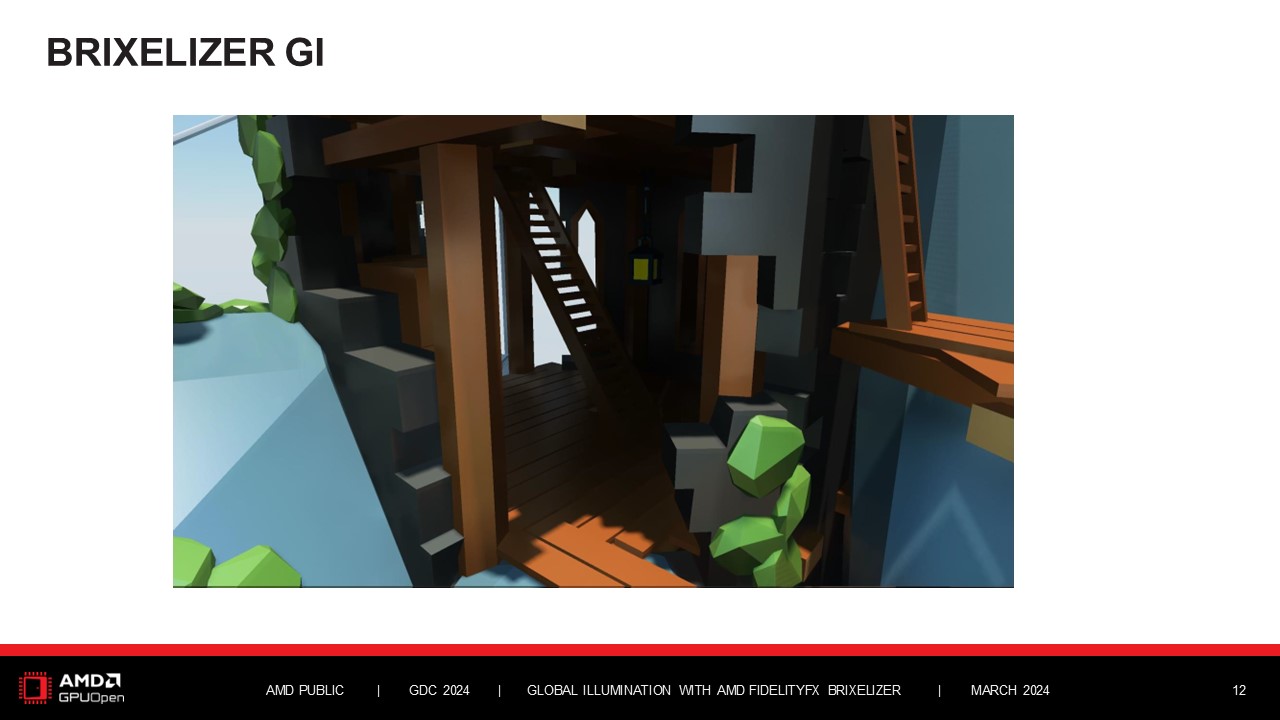먼저 Brixelizer에 대한 간략한 개요와 작동 방식에 대해 설명한 다음 Brixelizer GI를 소개합니다. 그런 다음 알고리즘을 단계별로 살펴보고 몇 가지 실측 비교와 성능 수치를 살펴본 다음 API의 모양과 애플리케이션에 통합되는 방식을 살펴봅니다. 마지막으로 FidelityFX SDK 업데이트로 마무리하겠습니다. 그럼 시작해 보시죠.