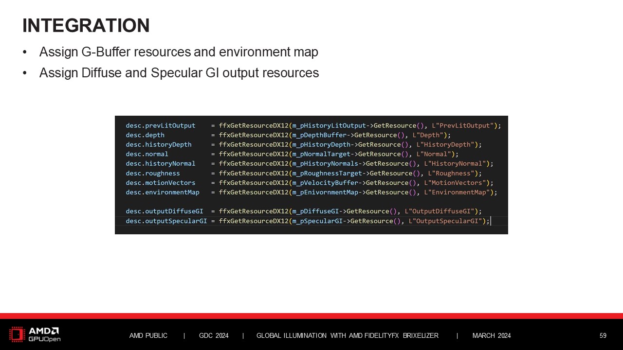 이제 Brixelizer GI API와 애플리케이션에 통합하는 방법을 살펴보겠습니다. Brixelizer GI를 사용하려면 기존 Brixelizer 통합이 필요하므로 선택한 API에 대한 FidelityFX 백엔드 및 Brixelizer 컨텍스트를 생성해야 합니다. 애플리케이션을 Brixelizer GI 라이브러리에 연결하고 ffx_brixelizer_gi.h 헤더를 포함합니다. 그런 다음 필요한 플래그(이 경우 반전 깊이)를 전달하여 Brixelizer GI 컨텍스트를 생성합니다. 그리고 필요한 품질 설정, 출력 해상도, 백엔드 인터페이스 등을 지정합니다.