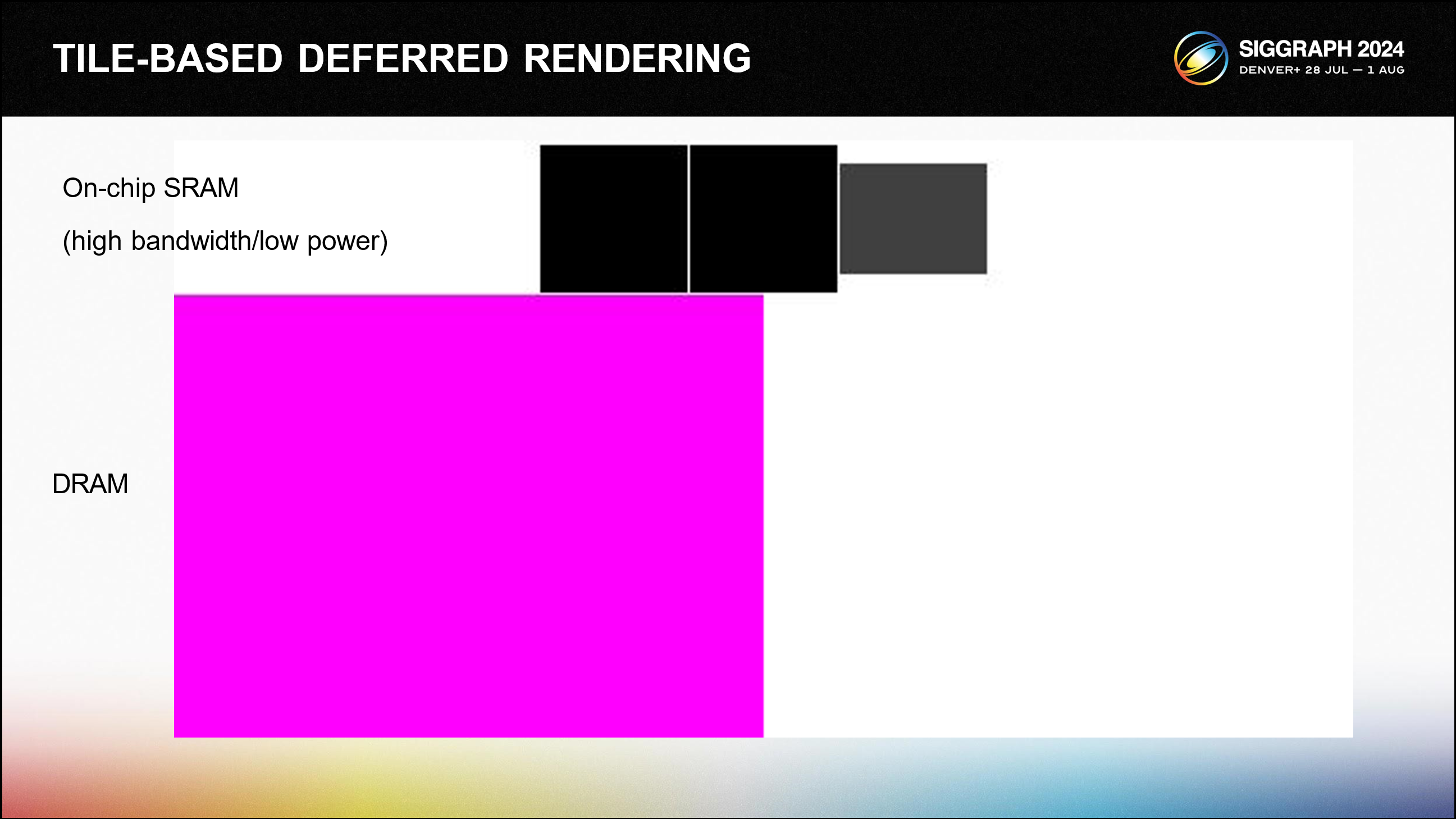 TBDR에서는 GPU가 이미지의 작은 타일을 선택하고 고성능 온칩 메모리에 래스터화한 다음 최종 출력만 메인 시스템 DRAM에 저장합니다. 모든 오버드로는 온칩에서 발생하며 경우에 따라 완전히 제거될 수도 있습니다.