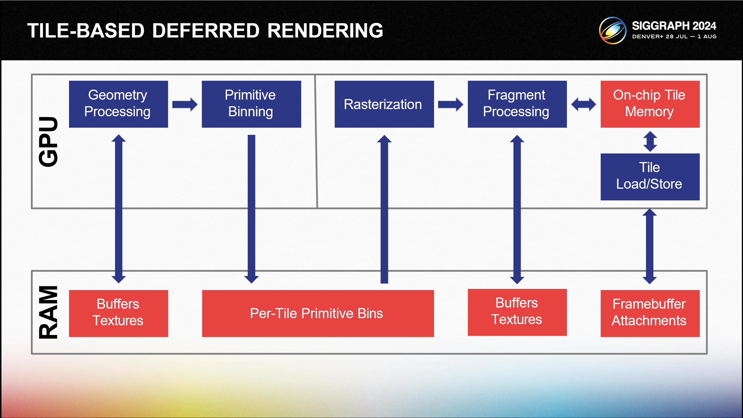 여기서 중요한 점은 타일을 위한 모든 프레임버퍼 메모리가 이제 GPU 자체에 위치한 작고 빠른 메모리, 즉 이 다이어그램의 '온칩 타일 메모리'에 들어갈 수 있다는 것입니다.