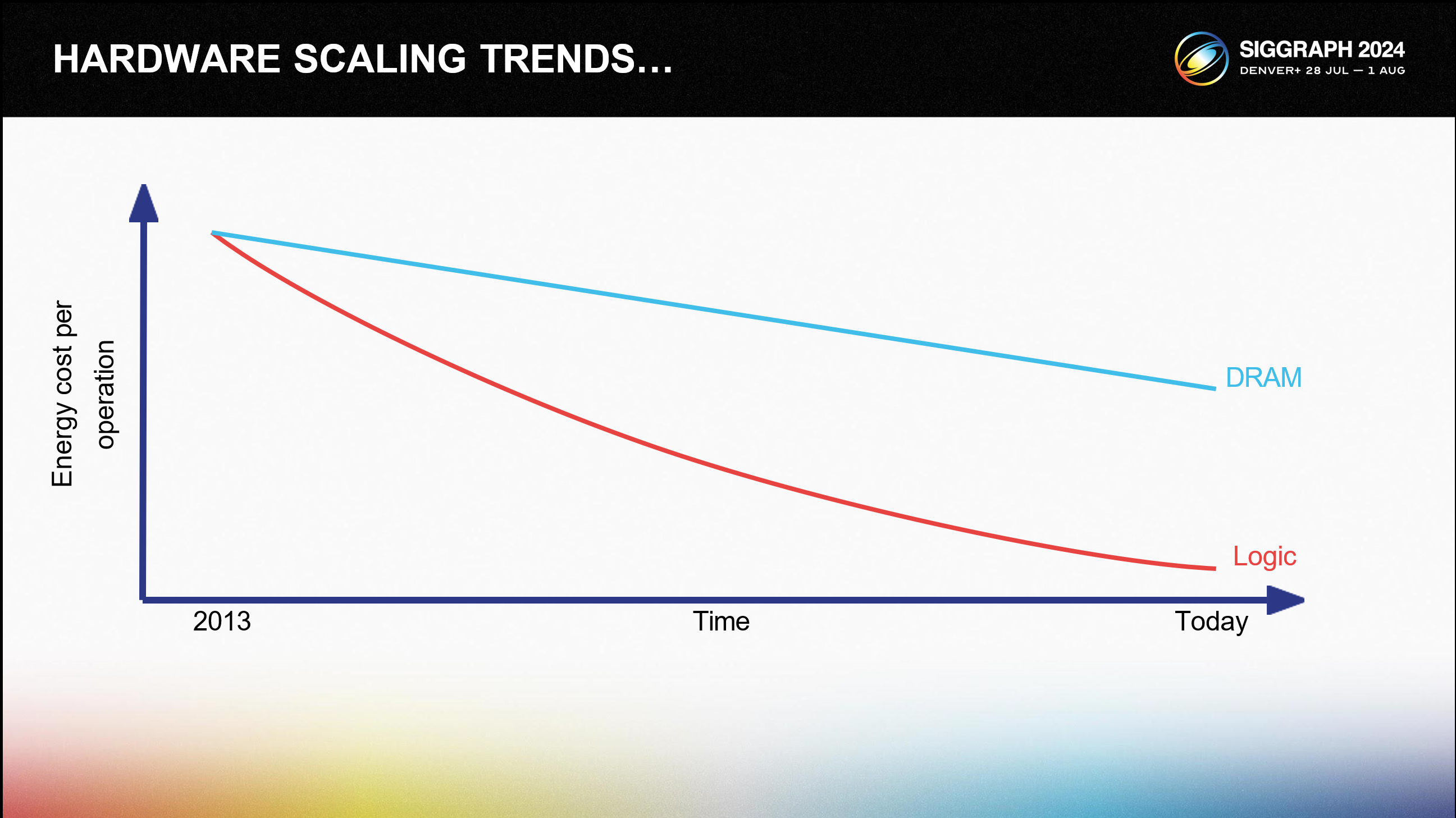 우리는 동일한 전력 예산에 점점 더 많은 산술 논리를 담을 수 있도록 관리하고 있습니다. DRAM 에너지 비용은 개선되었지만 동일한 비율로 개선되지는 않았습니다.