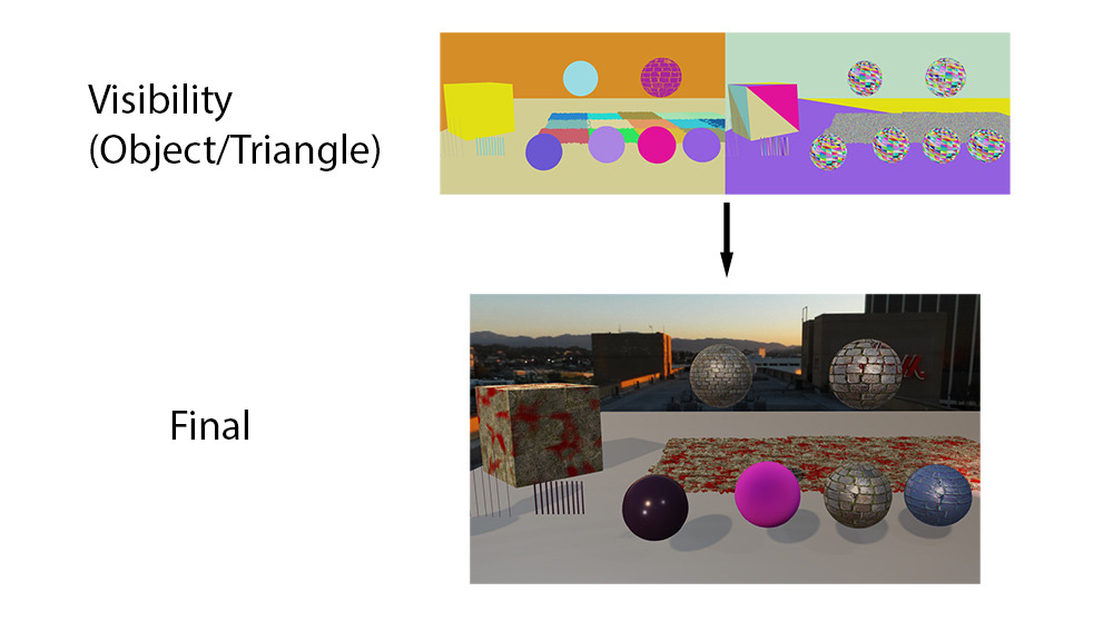 가시성 렌더링은 매우 다른 접근 방식을 취합니다. 가시성은 조명 색상(예: Forward)이나 GBuffer 데이터(예: Deferred)를 래스터화하는 대신 삼각형과 그리기 호출에 대한 ID만 래스터화합니다. 이심좌표(바리센트릭 좌표)나 도함수(미분)를 저장할 수도 있지만, 여기서는 단일 삼각형 ID를 사용하겠습니다.