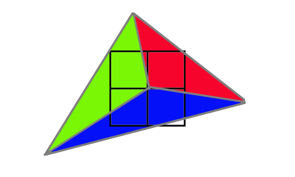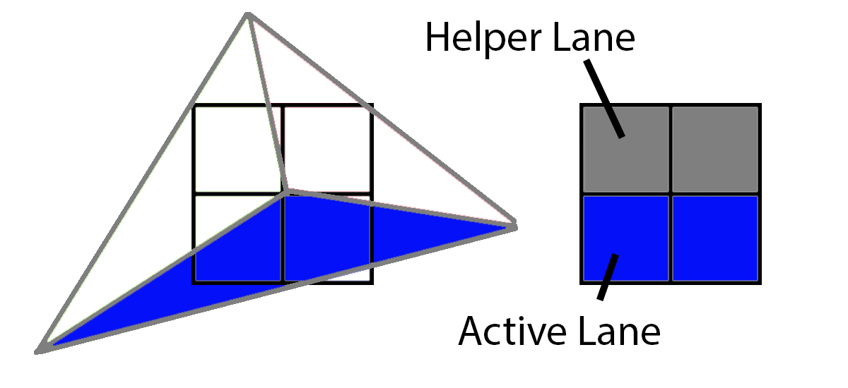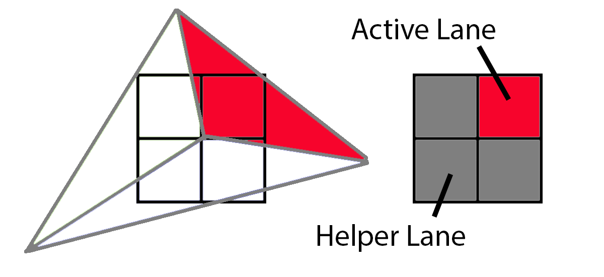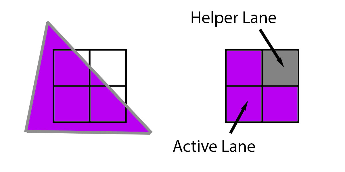 하지만 아래 삼각형처럼 삼각형이 4개의 픽셀을 모두 덮지 않고 3개의 픽셀만 덮는 경우에는 어떻게 될까요? 이 경우 GPU는 누락된 픽셀에 삼각형을 추정하여 평소처럼 실행합니다. 실제로 실행되는 3개의 픽셀을 "활성 레인"이라고 하고, 나머지 3개의 픽셀에 파생물을 제공하기 위해 실행되는 1개의 픽셀을 "헬퍼 레인"이라고 합니다.