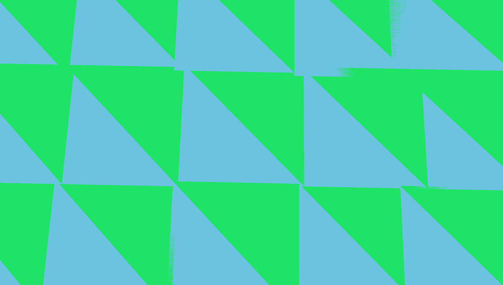 이 샘플에서는 3개의 서로 다른 삼각형이 2x2 그리드에서 샘플 중심을 덮고 있습니다. 먼저 녹색 삼각형은 왼쪽 상단 모서리를 덮고 있습니다. 이를 렌더링하기 위해 GPU는 왼쪽 상단 픽셀을 활성 레인으로 렌더링하고 나머지 세 개는 헬퍼 레인으로 음영 처리하여 하나의 활성 레인에 텍스처 파생물을 제공합니다.
