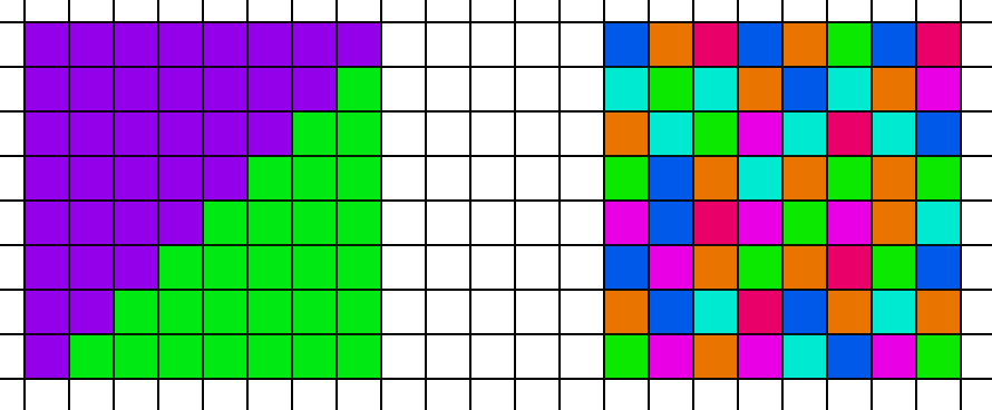 그런데 왜 가시성 머티리얼 패스가 큰 삼각형의 경우보다 더 오래 걸릴까요? 결국 같은 수의 픽셀에서 실행되는 동일한 셰이더이기 때문입니다. 문제는 캐시 일관성입니다. 두 가지 시나리오를 살펴봅시다. 왼쪽에는 두 개의 삼각형으로 분할된 8x8 픽셀 블록이 있고, 오른쪽에는 8x8 블록의 각 픽셀이 다른 삼각형을 가리키고 있습니다.