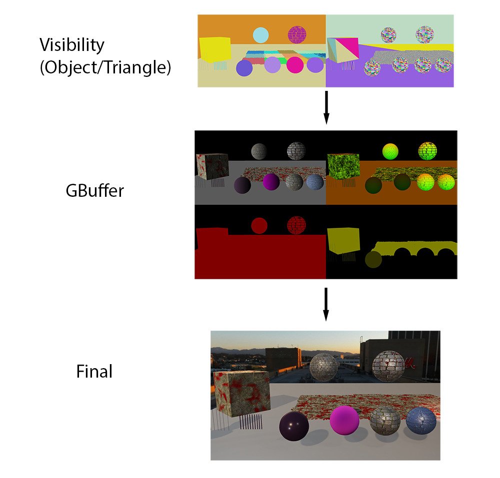 이론적으로 비저빌리티 렌더링에는 GBuffer가 필요하지 않습니다. 노멀이 필요한 경우 언제든지 버텍스 파라미터에서 직접 가져올 수 있습니다. 그리고 다시 필요하면 다시 가져올 수 있습니다. 하지만 실제로 머티리얼 그래프는 이미 상당히 길고 매년 점점 더 길어지고 있습니다. 직접 조명만 필요하다면 GBuffer 없이도 할 수 있습니다. 하지만 직접 조명, 스크린 공간 반사, 앰비언트 프로브 등 프레임당 일반적인 여러 번과 같은 값이 필요하므로 머티리얼 출력을 GBuffer에 저장하는 것이 가장 좋은 방법인 것 같습니다.