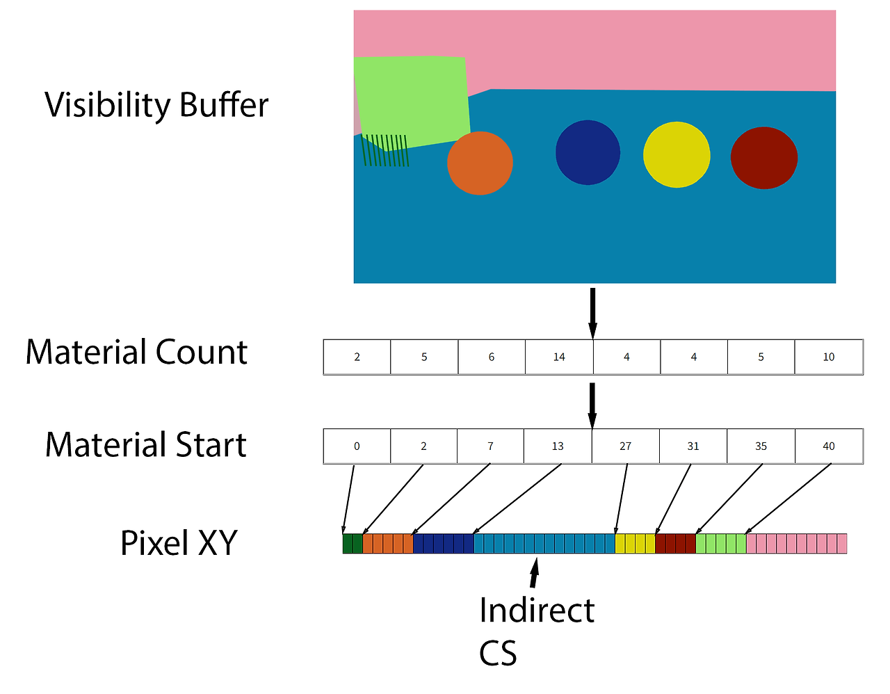 - 가시성 버퍼를 통해 다른 패스를 실행하여 각 픽셀의 XY 위치를 픽셀 XY 버퍼의 적절한 위치에 저장합니다. 픽셀 XY 버퍼에는 가시성 버퍼와 동일한 수의 요소가 있다는 점에 유의하세요.