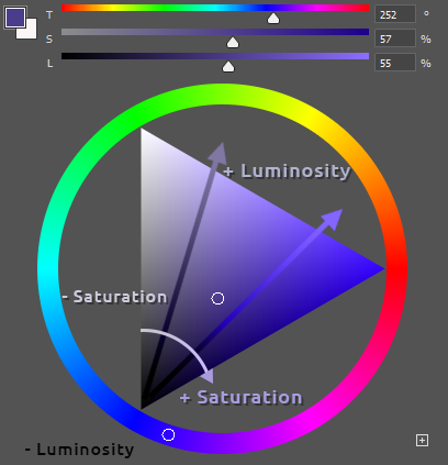 0에서 255 까지의 원색 혼합을 말하는 것보다 색조, 채도(또는 색조의 '순도'를 나타내는 색도), 밝기(밝기)로 색상을 설명하는 것이 훨씬 간단하기 때문에 RGB가 아닌 HSL을 사용합니다. 감사합니다.