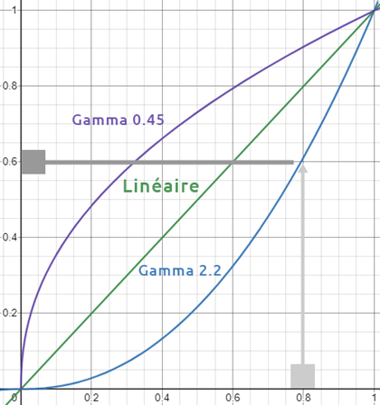 감마 곡선 2.2의 경우, 0.8 입력은 0.6 출력을 제공합니다.