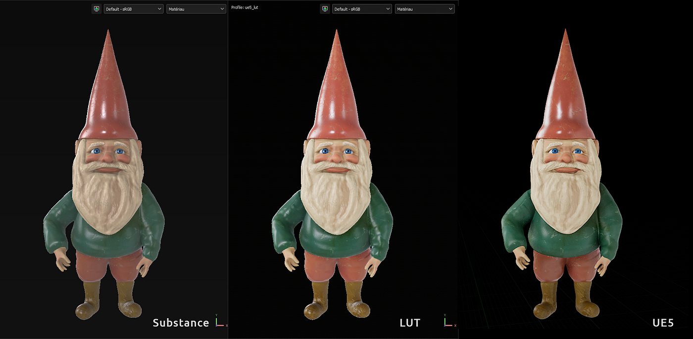 LUT는 서브스턴스의 기본 색상 관리 또는 OpenColorIO를 색상 관리로 사용하는 경우 sRGB 디스플레이와 함께 사용해야 합니다. (ACES sRGB를 사용하면 UE5에 가까워지지만 제 테스트에서는 sRGB + LUT만큼 가깝지는 않았습니다.)
