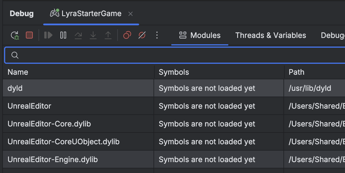 Rider 2024.2는기본 디버거에 모듈 뷰를 지원합니다. 이 기능은 .NET용 Rider 2023.3에서 처음 도입되었으며, 이제 언리얼 게임에서도 사용할 수 있습니다. 모듈 뷰는 디버그 툴 창의 새 탭으로, 로드된 모든. dll 또는 . so 파일 목록과 경로에 대한 세부 정보, 모듈에 로드된 심볼이 있는지 여부가 표시됩니다.
