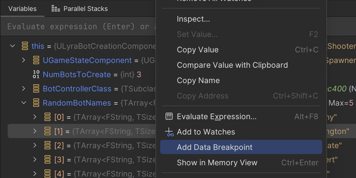 또 다른 큰 삶의 질 향상은 이제 watch 에 추가 작업이 훨씬 더 안정적으로 더 많은 시나리오에서 작동한다는 것입니다. 디버거에서 오브젝트를 볼 때는 일반적으로Natvis 프레임워크에서 제공하는 사용자 친화적인 커스텀 오브젝트 뷰를 보게 됩니다. 예를 들어 디버거는 STL 또는 언리얼 컨테이너의 내부 값을 표시하는 대신 컨테이너 내부의 항목을 표시하여 사용자가 예상하는 데이터를 보여줄 수 있습니다. 이 커스텀 뷰는 이러한 합성 오브젝트 멤버 중 하나에 custom watch 를 추가하는 것이 매우 복잡하다는 것을 의미하지만, 이제 Rider 2024.2는 Watch를 추가하기 위해 우클릭하면 올바른 표현식을 생성합니다.