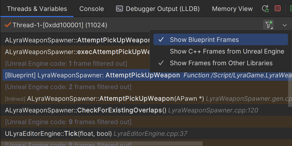 특히 콜스택에 익명의 메모리 주소만 표시되는 경우 코드가 호출되는 위치를 정확히 파악하기가 까다로울 수 있습니다. 다행히 Rider는이러한 메모리 주소를 블루프린트 프레임으로 해석하고 코드가 호출되는 블루프린트를 표시하여 도움을 줄 수 있습니다. 이 기능은 2024.1에 처음 등장했지만 새 릴리스에서 몇 가지 업데이트가 이루어졌습니다. Rider가 코드가 어떻게 사용되고 있는지 알려주면 정말 유용합니다!