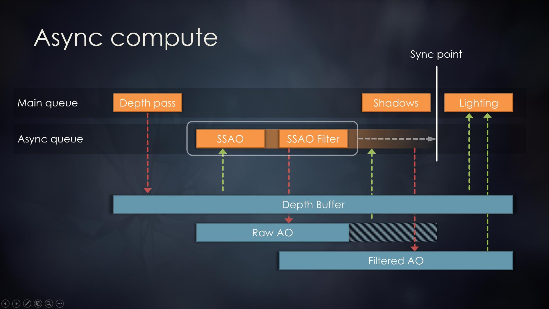 종속 그래프 데이터 구조에 대한 전체 프레임 인식과 최신 그래픽 API의 기능이 결합되어 RDG가 백그라운드에서 복잡한 스케줄링 작업을 수행할 수 있습니다: