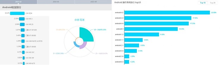"2015년 2월, 샤오미의 Redmi는 중국 안드로이드 시장에서 6.12%의 점유율을 차지했으며, 18-24세 연령대의 사용자가 전체의 85.26%를 차지했습니다."