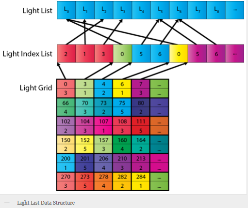- Light Grid는 Light Index List에서 각 클러스터의 시작과 끝 위치를 저장합니다