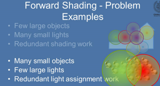 - 큰 물체가 작은 조명의 영향을 받을 때, 실제로 영향을 받지 않는 부분까지 N개의 조명에 대해 계산해야 하므로 중복 계산이 발생합니다. (일반적으로 많은 객체를 렌더링해야 하므로 이러한 중복성이 더욱 증가합니다)