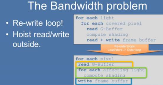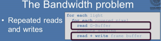 그러나 조명 계산을 수행할 때마다 G-buffer를 읽고 써야 하므로 조명이 많을 때 큰 대역폭 부하가 발생한다는 단점이 있습니다. 이러한 대역폭 문제는 점차 모바일 기기의 주요 성능 병목 현상이 되고 있습니다.