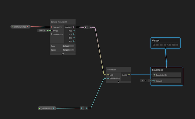 - 셰이더 그래프에서 채도를 조작하는 노드(saturation 노드)를 끼워 넣는 것만으로 간단해집니다.